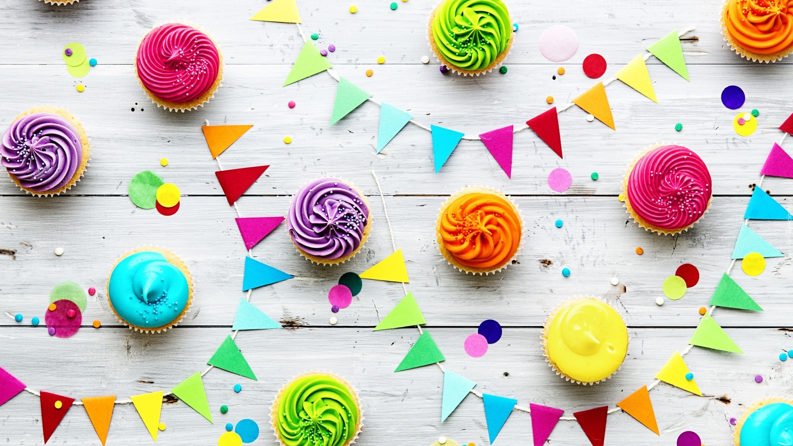 Edytor tapety: Kolorowe babeczki i girlandy na deskach