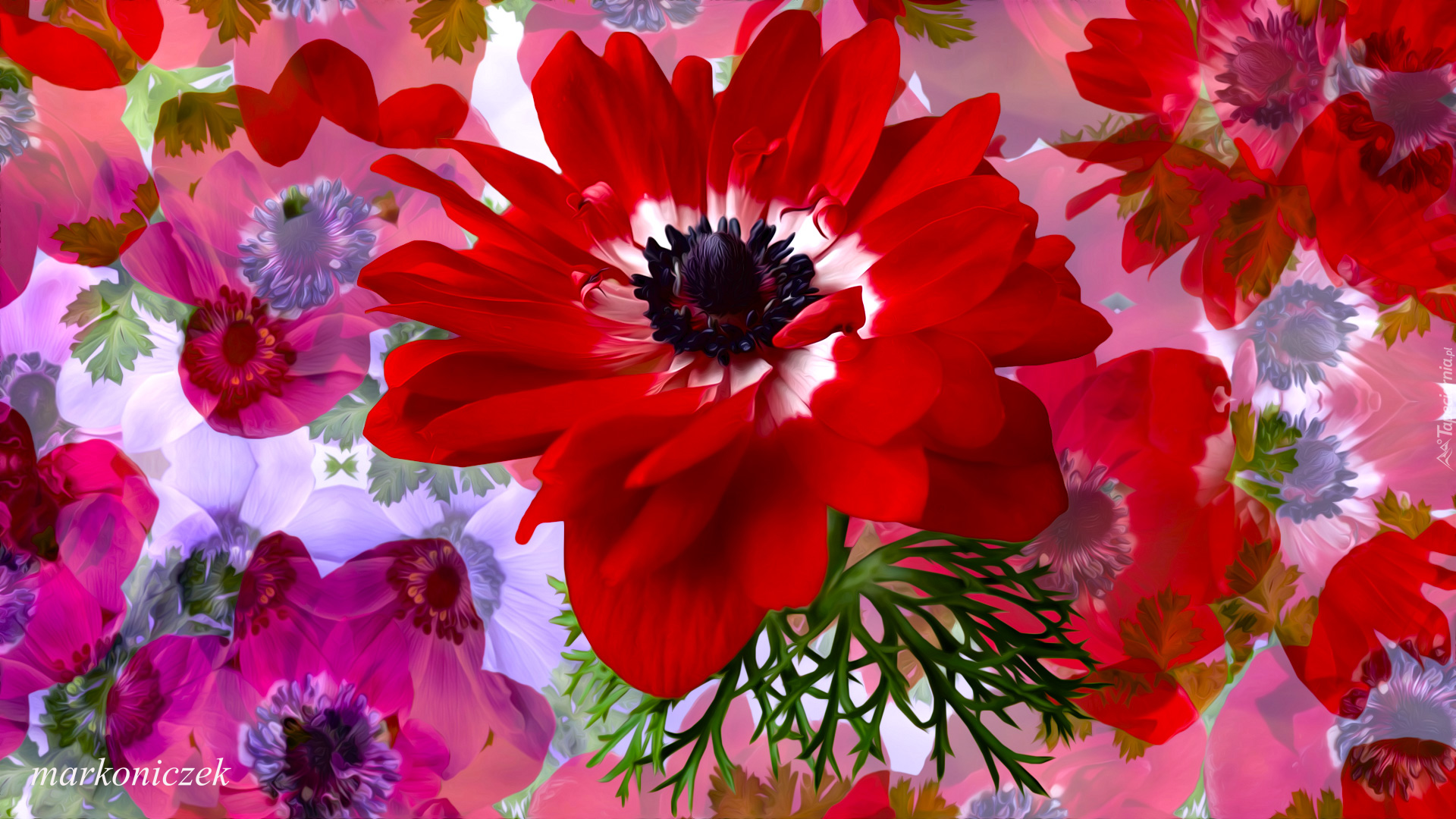 Edytor tapety: Czerwony zawilec na kwiatowym tle