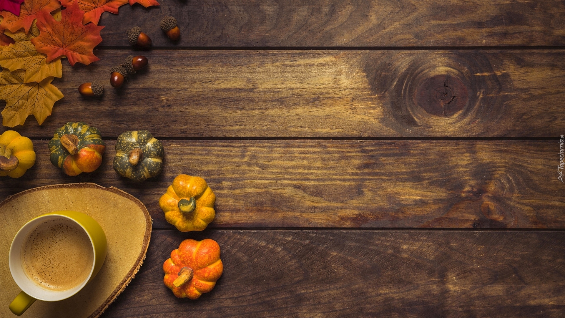 Edytor tapety: Dynie i żołędzie obok kawy