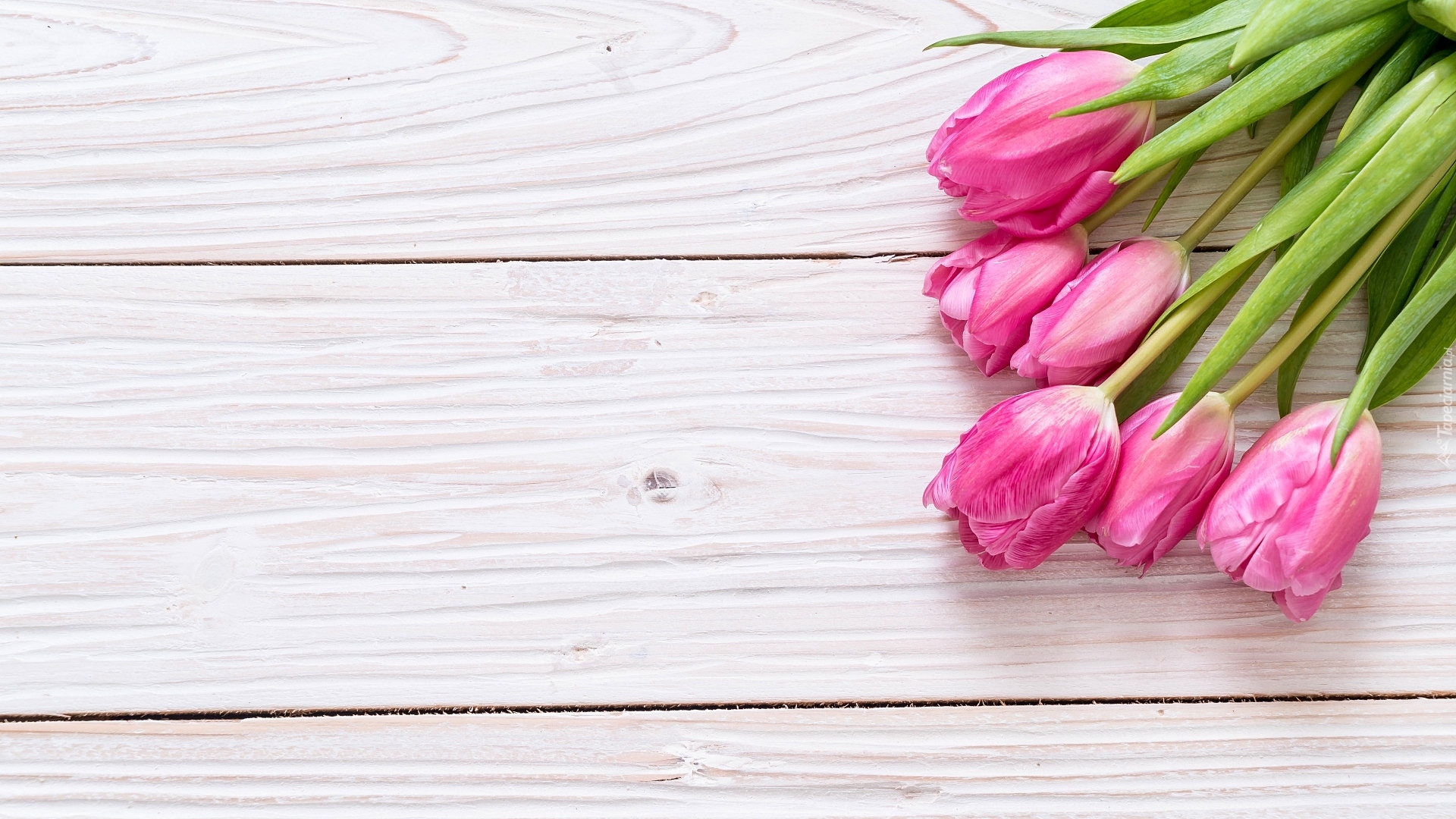 Edytor tapety: Różowe tulipany na jasnych deskach