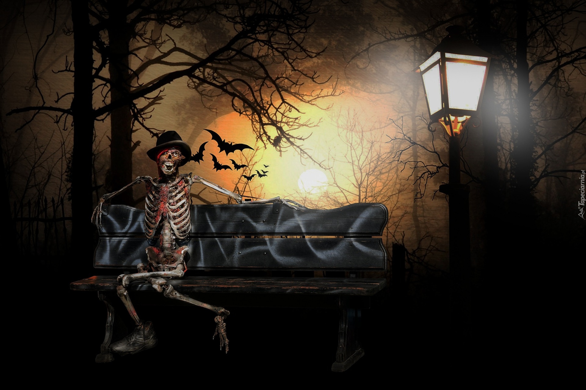 Edytor tapety: Szkielet na ławeczce w Halloween