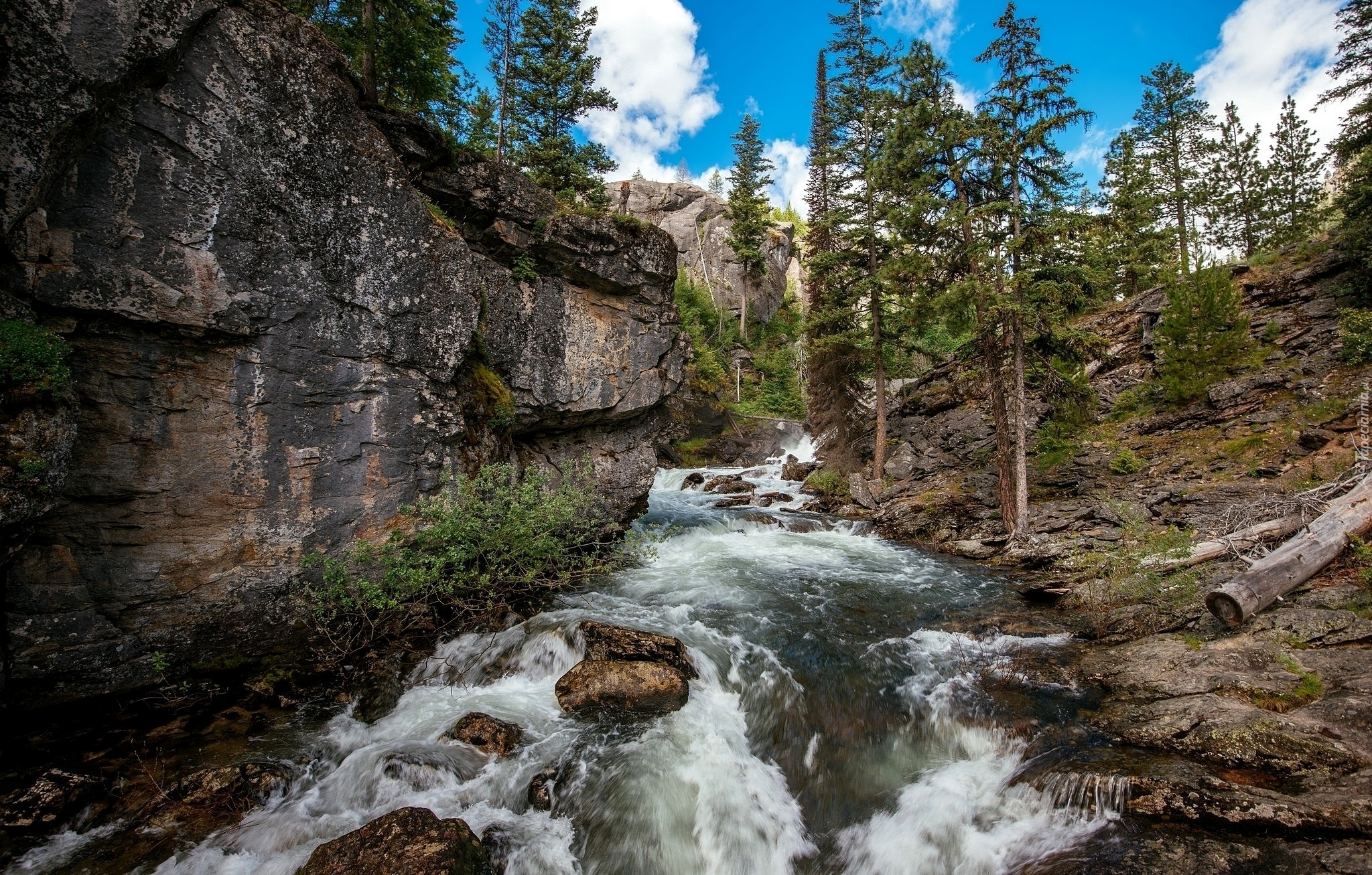 Edytor tapety: Świerki i skała nad rzeką