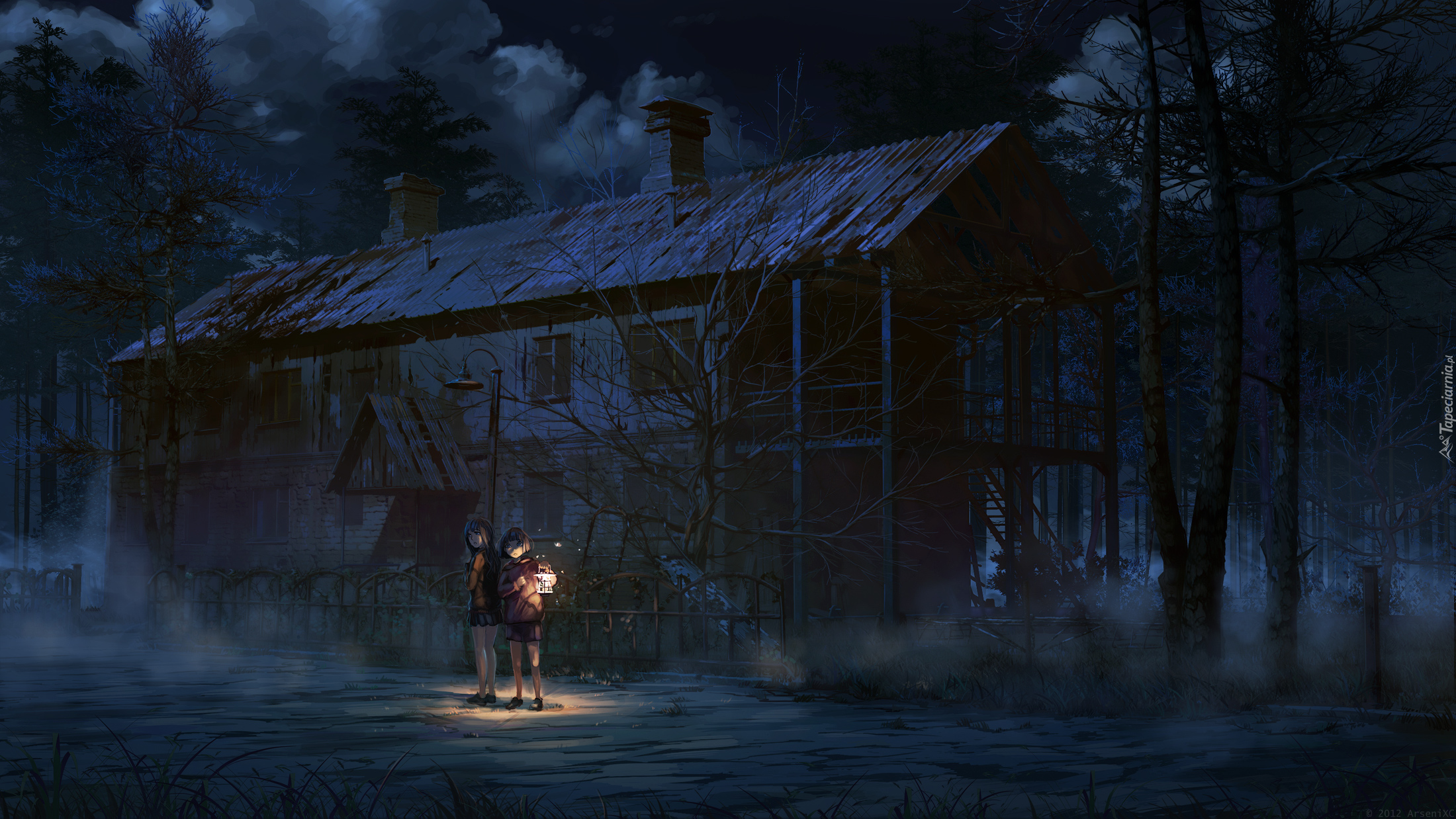Edytor tapety: Dziewczynki z lampą obok starego domu