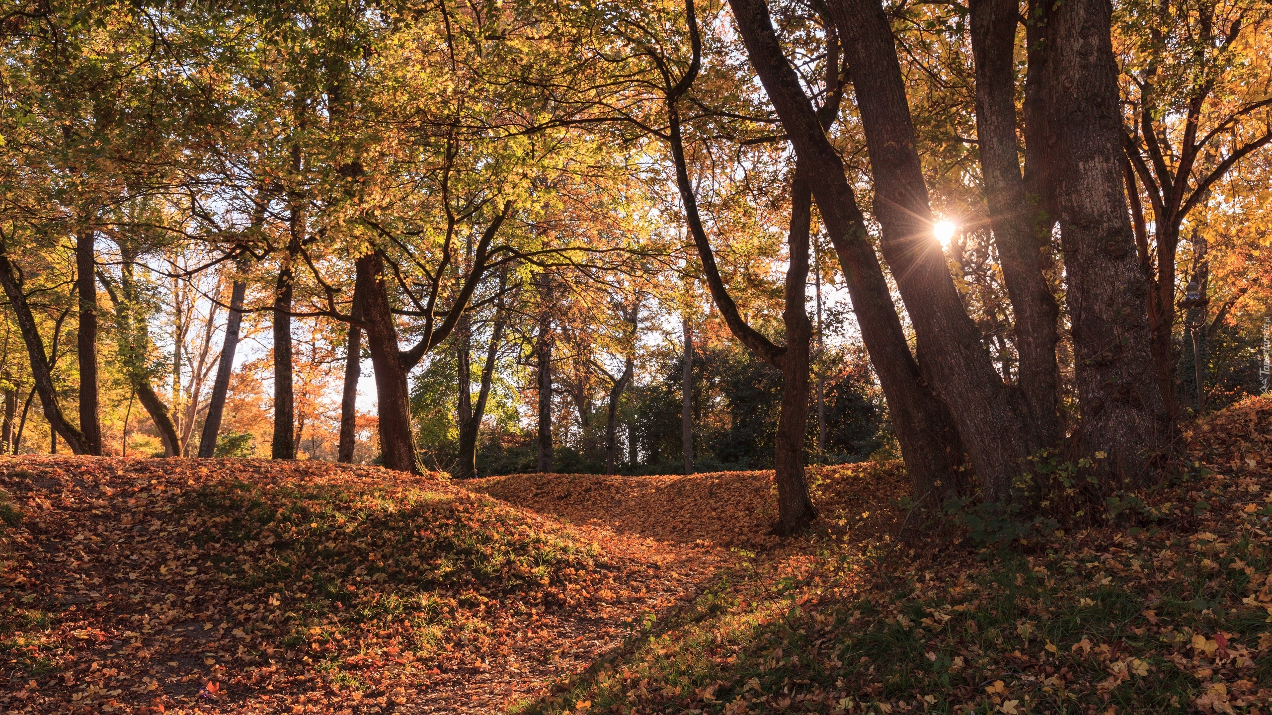 Edytor tapety: Promienie słońca między drzewami w parku