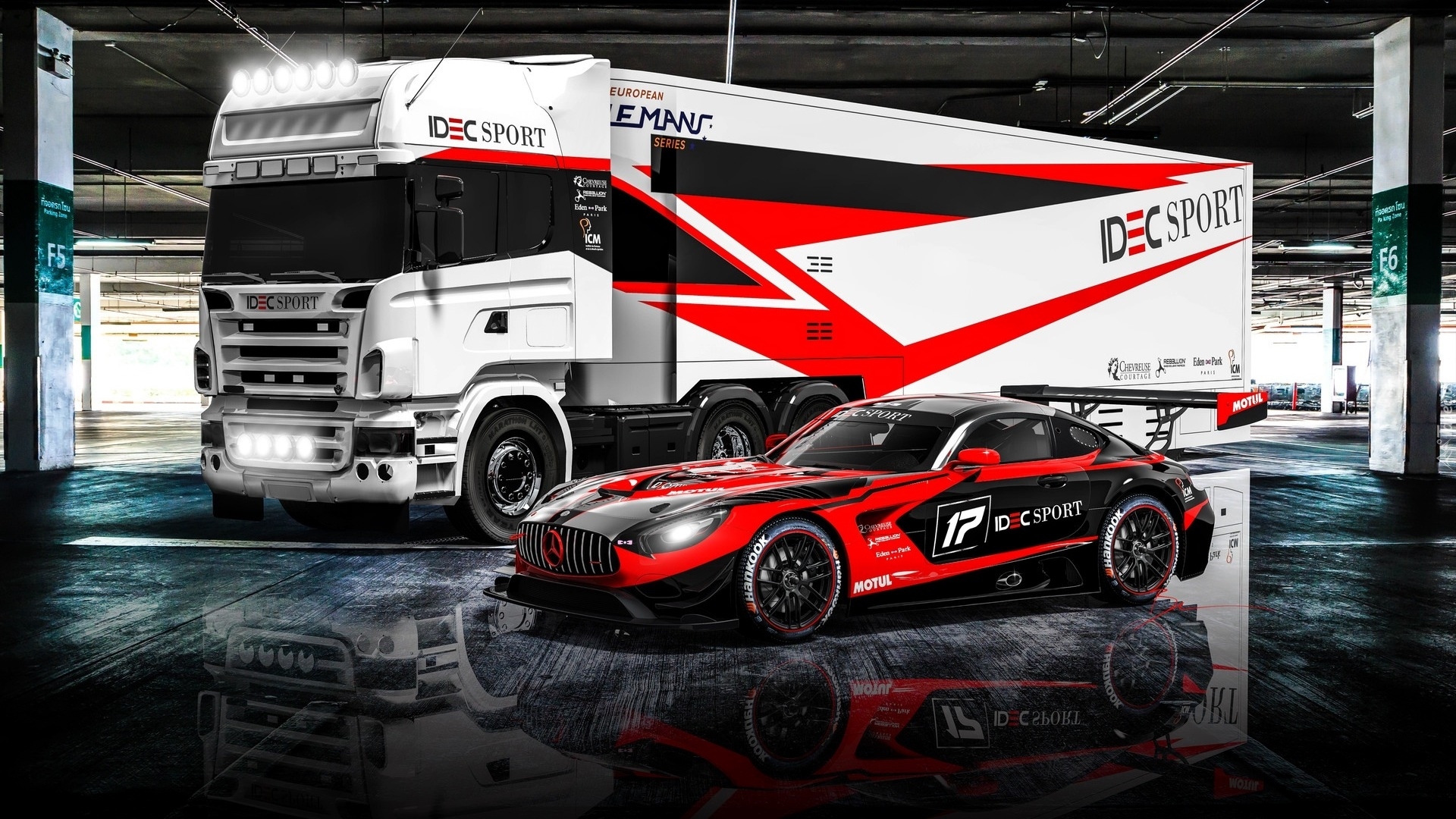 Edytor tapety: Mercedes AMG GT3 obok ciężarówki