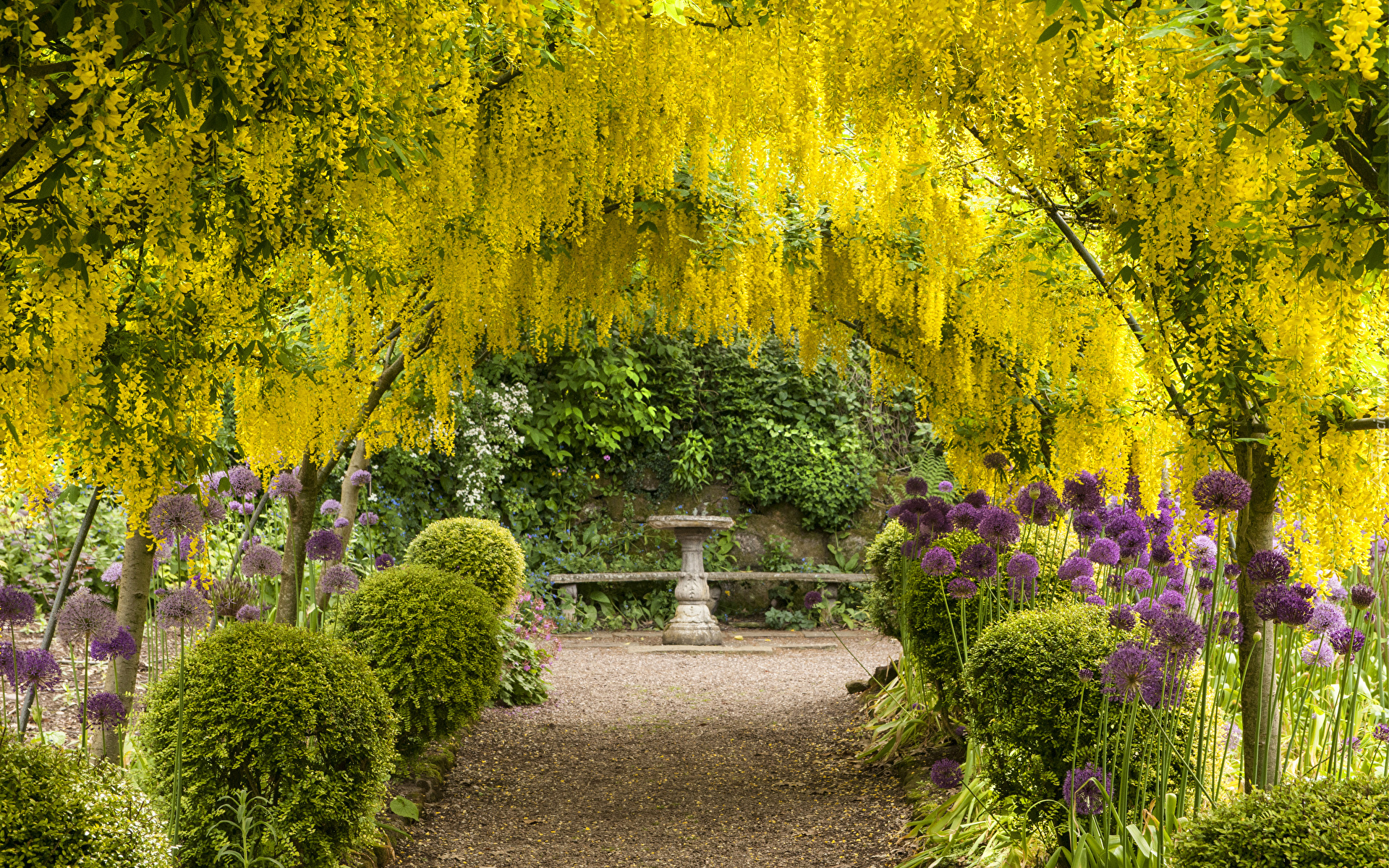 Edytor tapety: Żółta glicynia nad alejką w ogrodzie