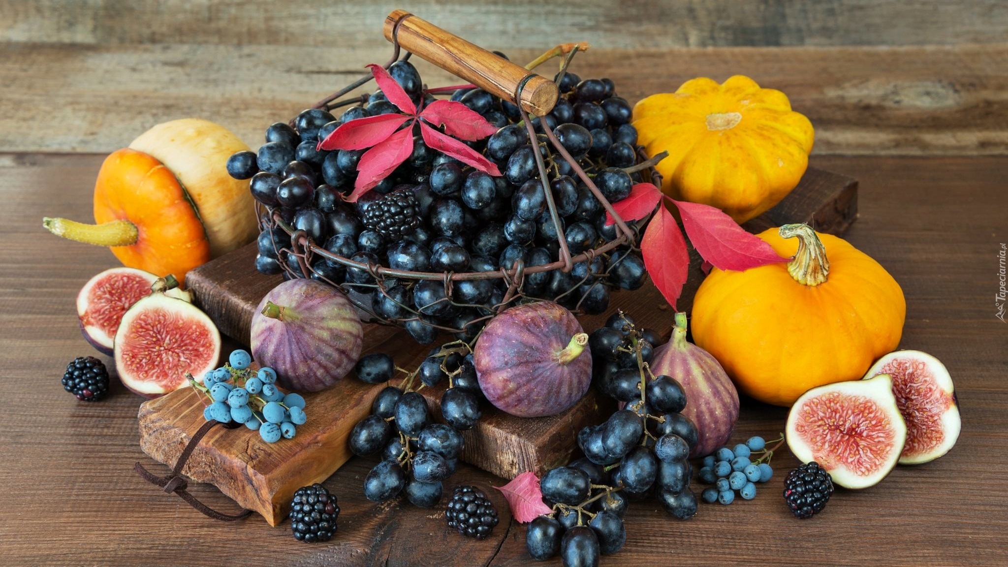 Edytor tapety: Dynie i figi obok winogron w koszyku