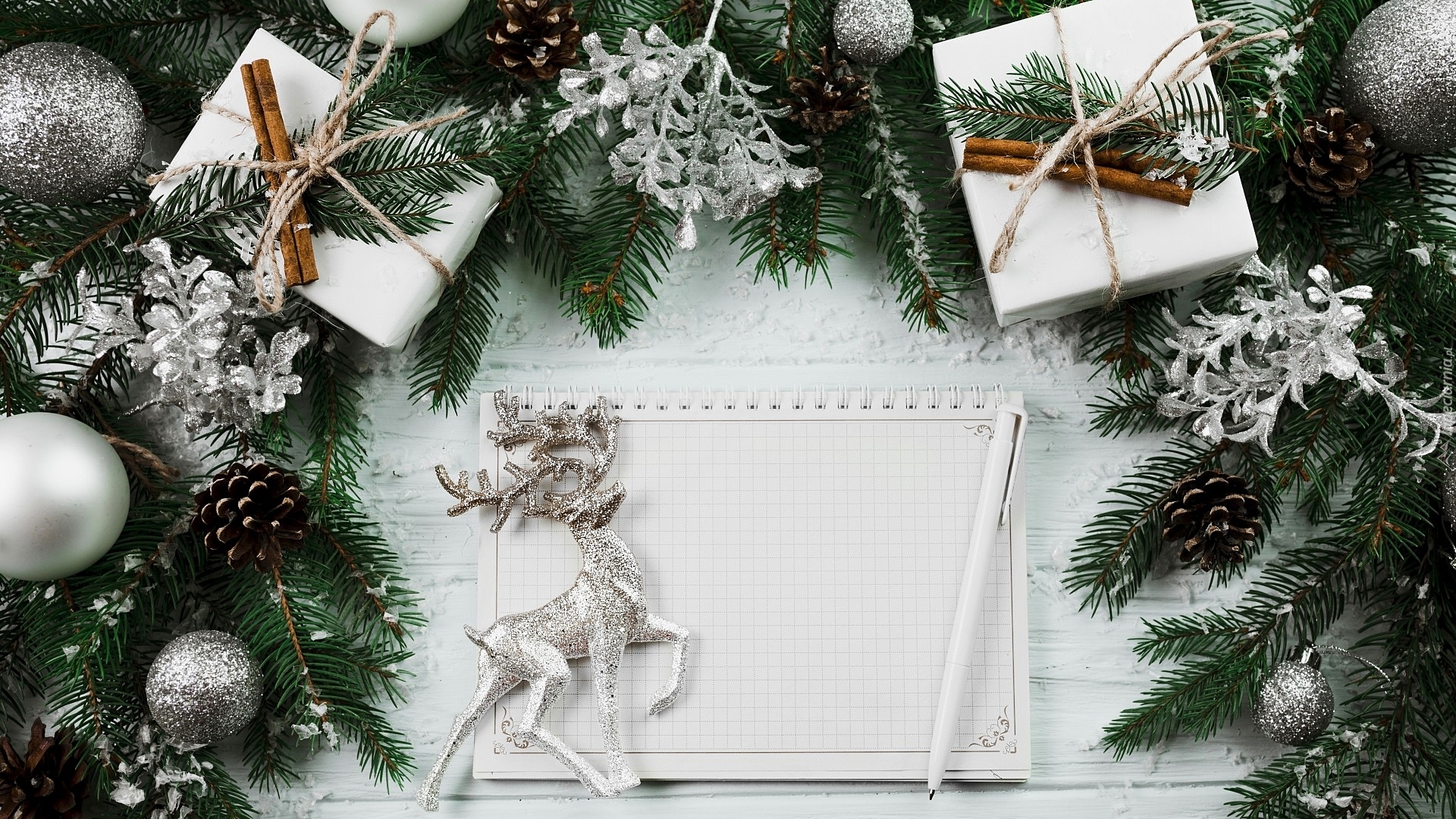 Edytor tapety: Bombki i prezenty na gałązkach świerku wokół notesu