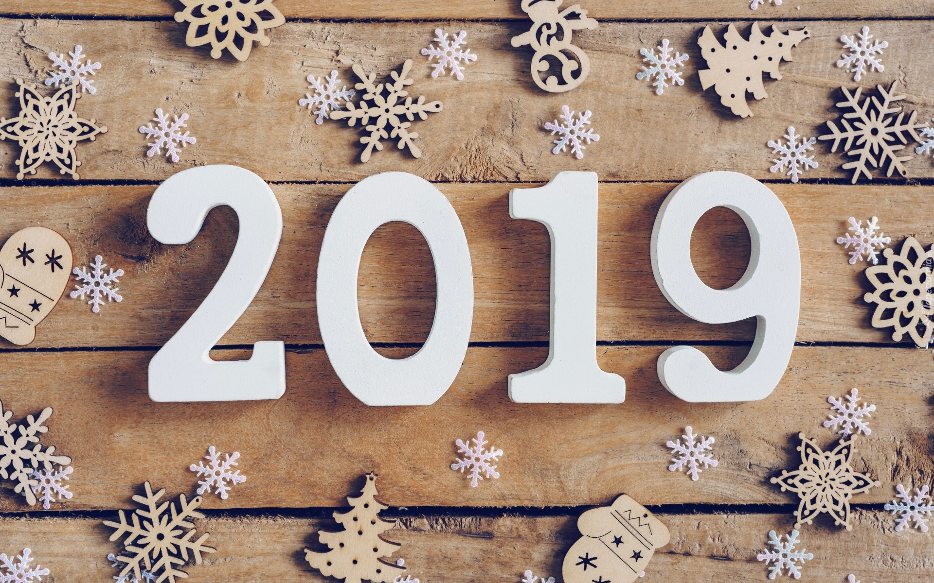 Edytor tapety: Napis 2019 na deskach pośród śnieżynek