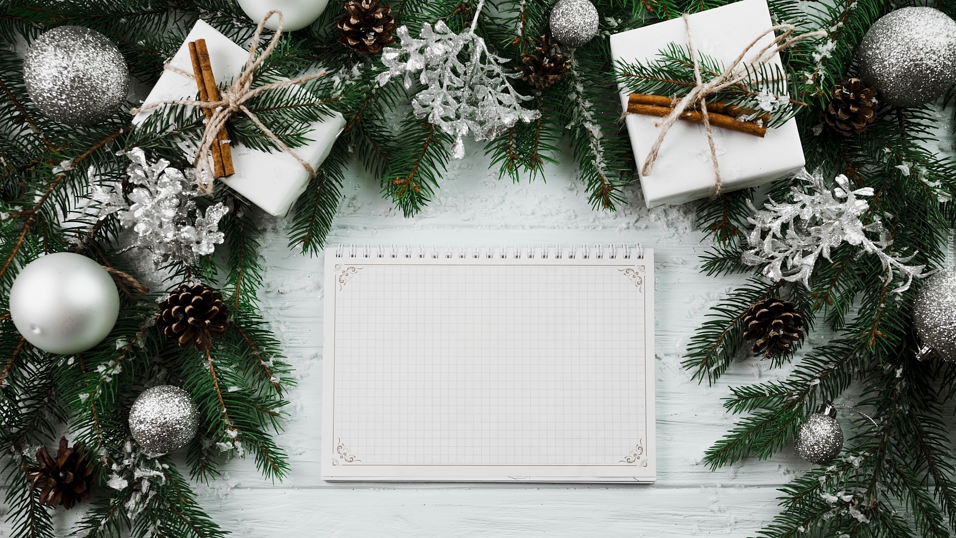 Edytor tapety: Srebrne bombki i prezenty na gałązkach świerkowych