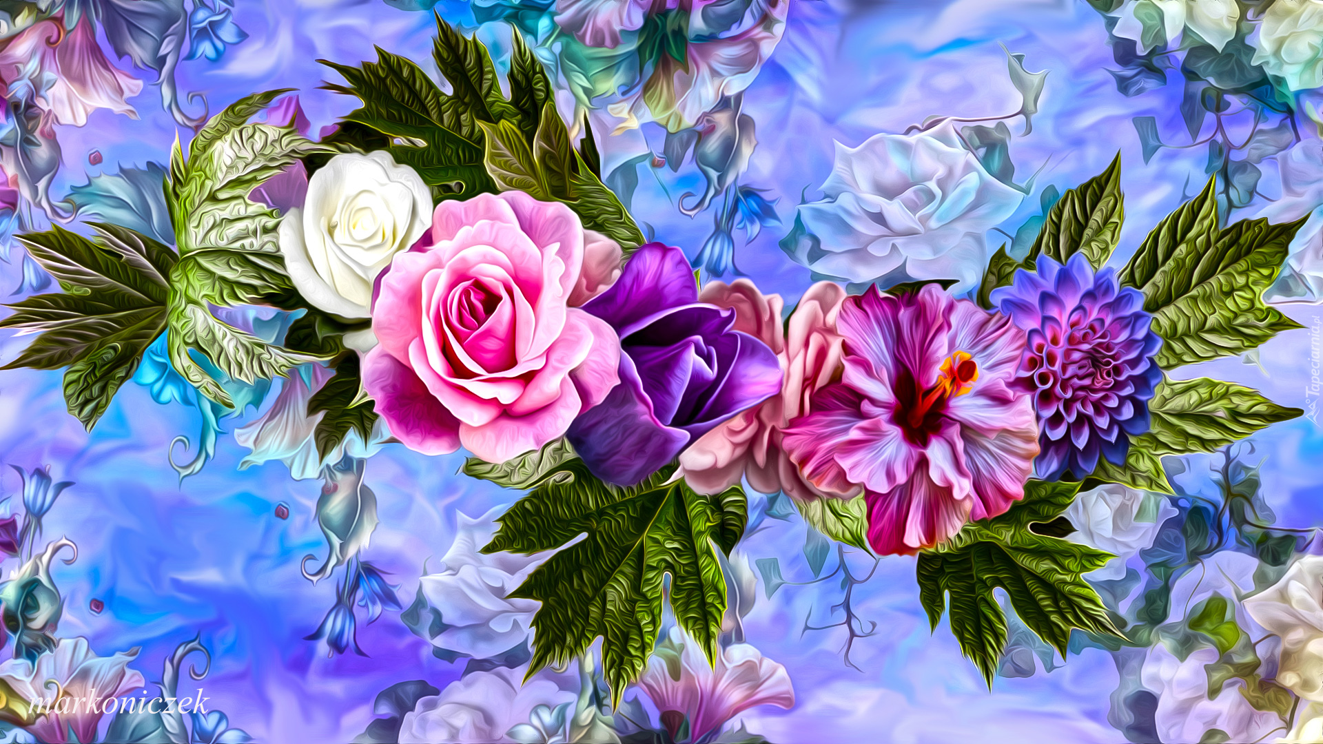 Edytor tapety: Róże, hibiskus i dalia w grafice