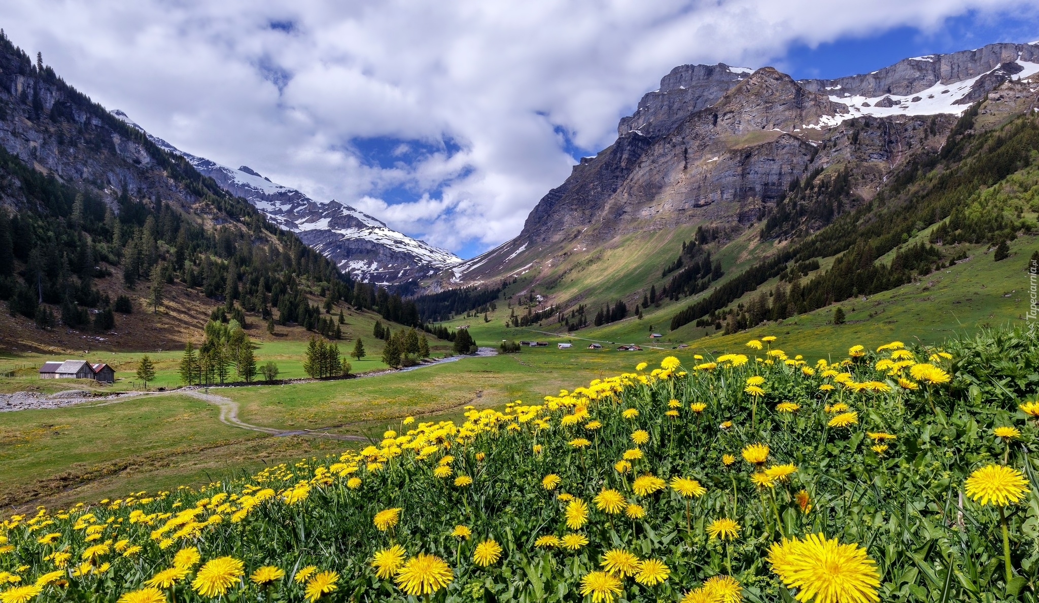 Edytor tapety: Łąka w dolinie pokryta mniszkiem na tle gór
