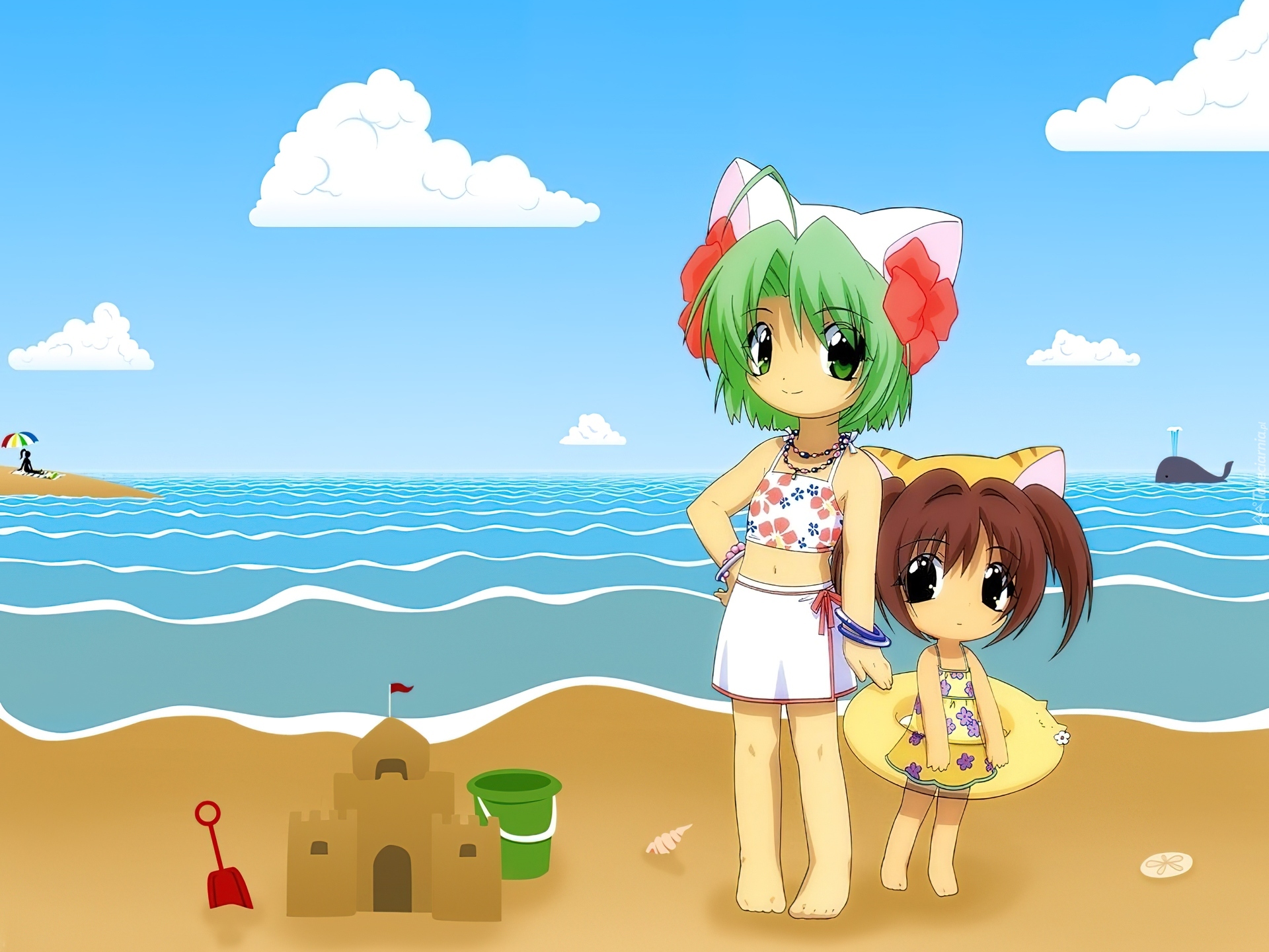 Edytor tapety: Digi Charat, morze, plaża, dziewczynki, wieloryb