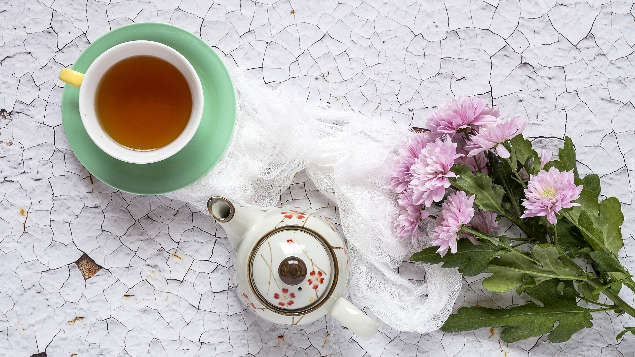 Edytor tapety: Herbata obok dzbanuszka i chryzantem