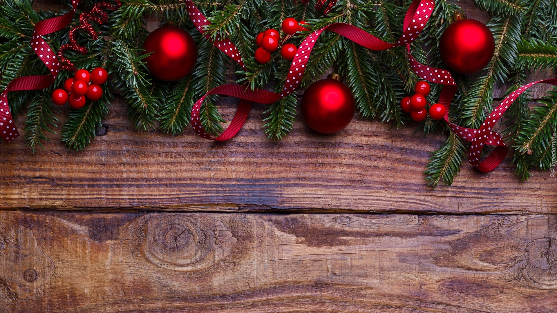 Edytor tapety: Czerwone bombki i wstążki na gałązkach świerku