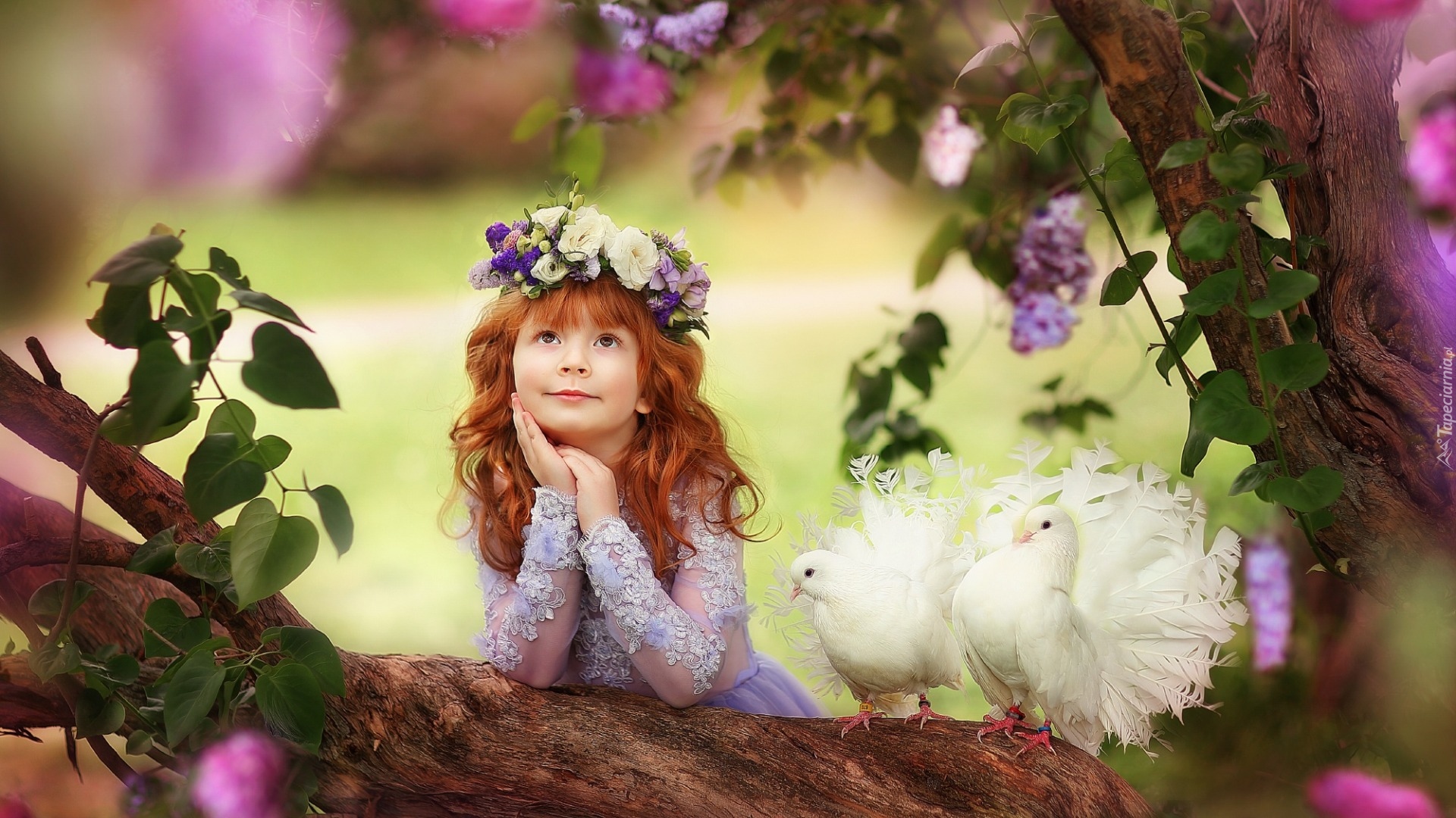 Edytor tapety: Rudowłosa dziewczynka obok białych gołębi