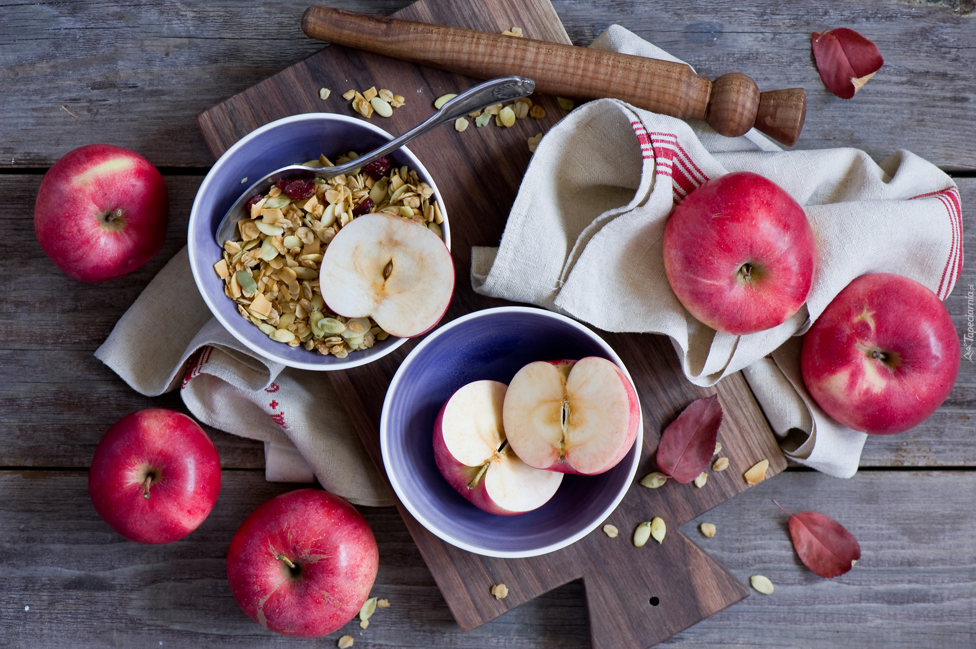 Edytor tapety: Płatki w miseczce i jabłka na deskach