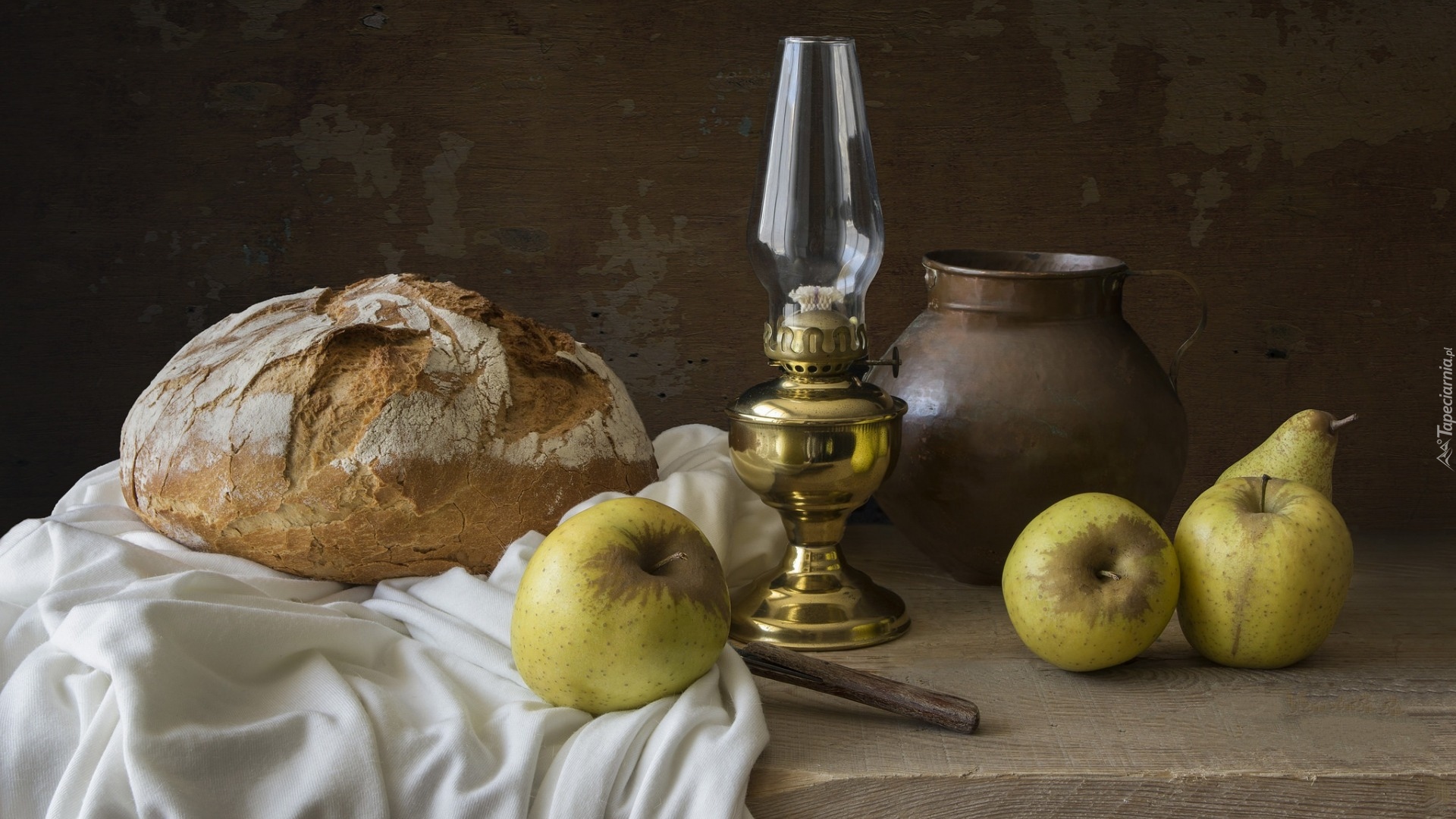 Edytor tapety: Bochenek chleba obok jabłek i lampy naftowej