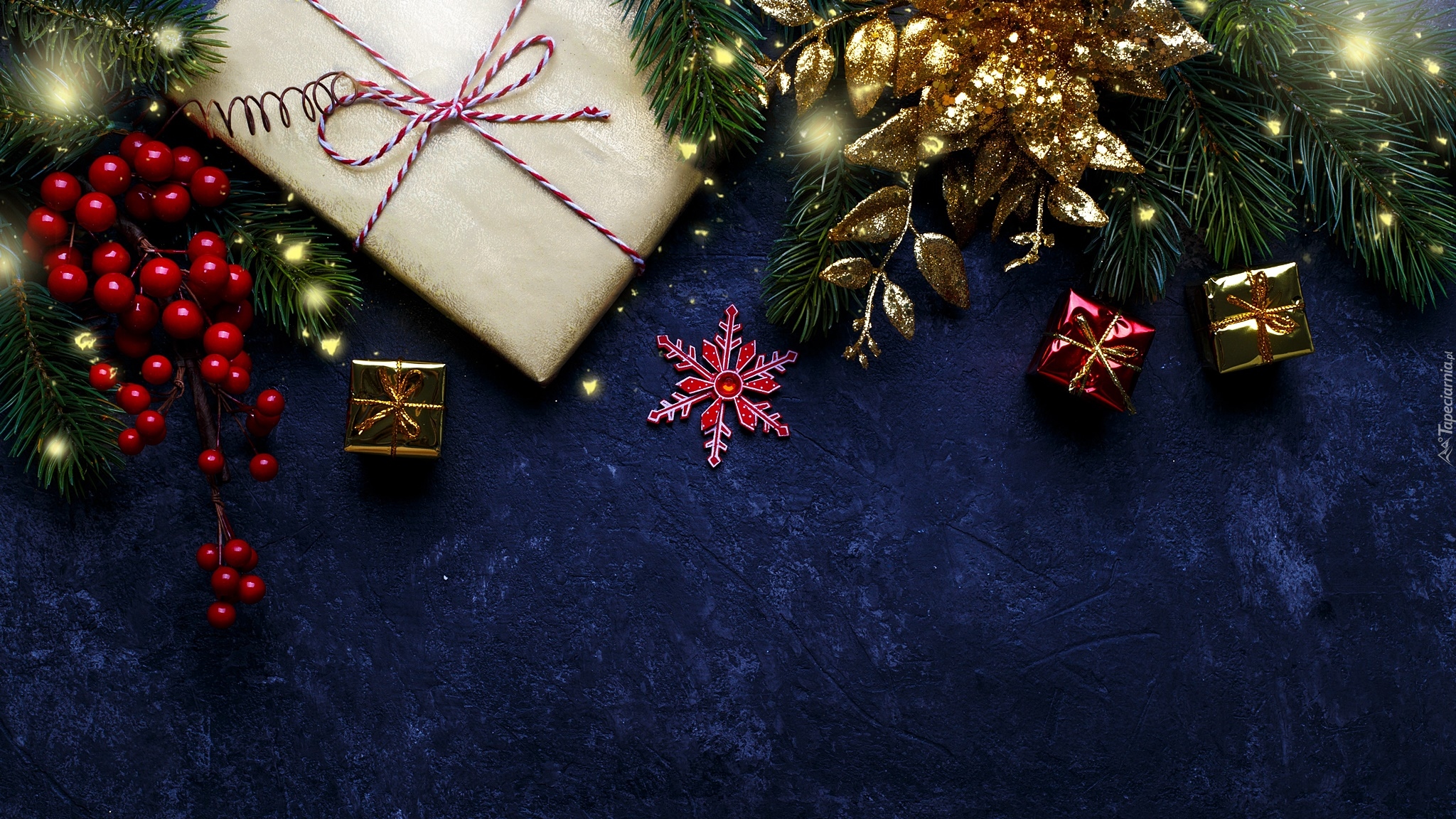 Edytor tapety: Prezent pośród gałązek świerkowych z ozdobami