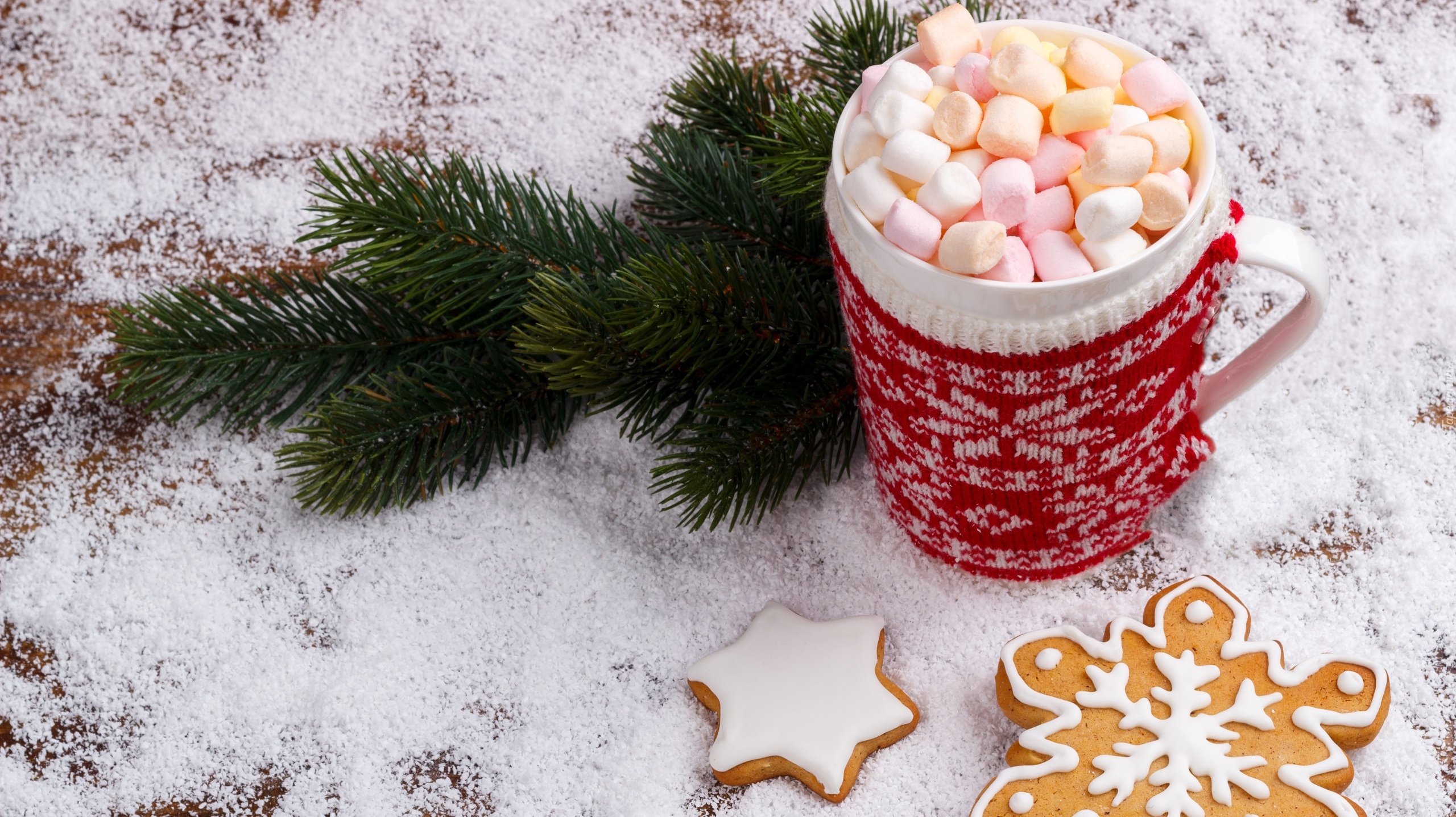 Edytor tapety: Pianki w kubku obok ciasteczek i gałązki