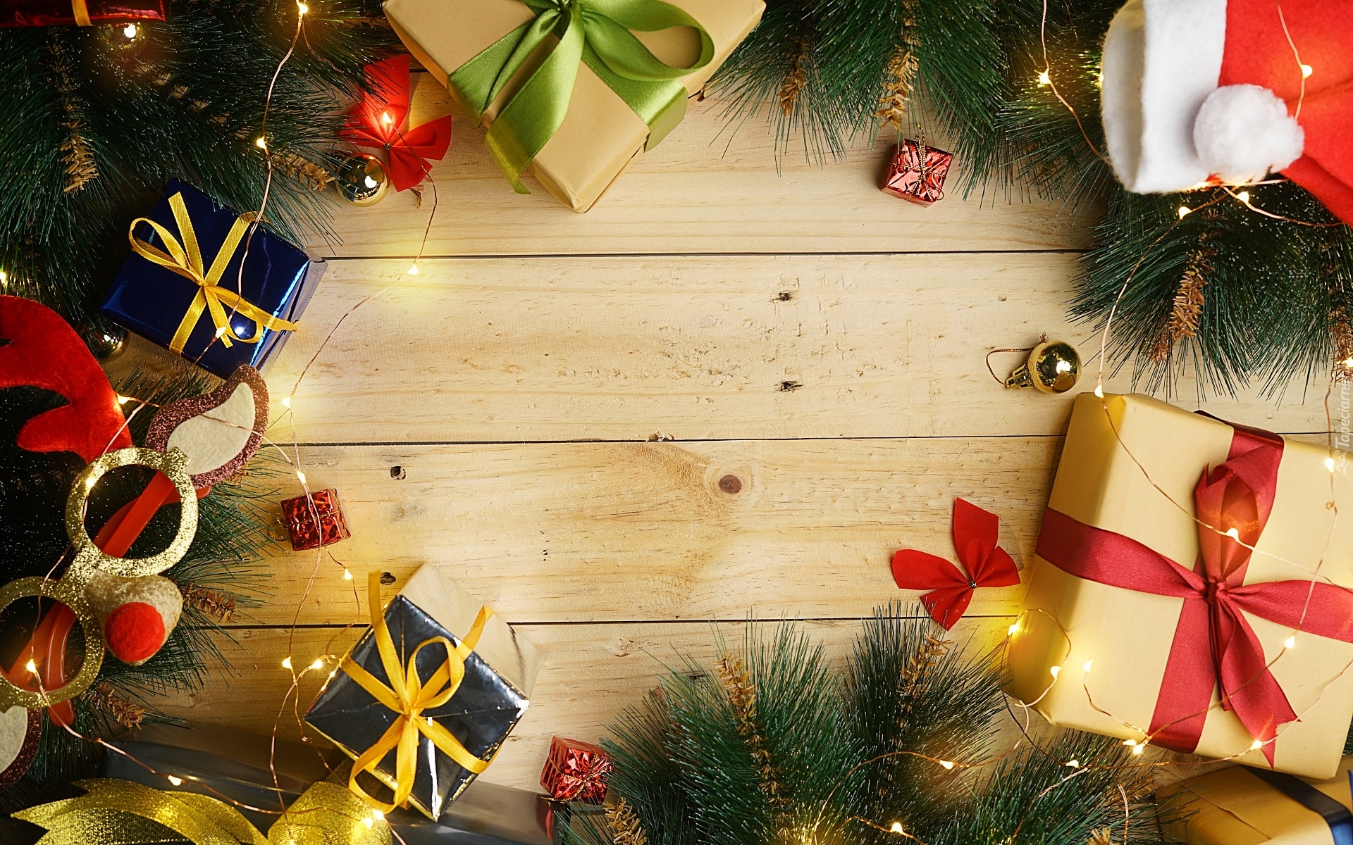Edytor tapety: Prezenty i ozdoby świąteczne ułożone na deskach