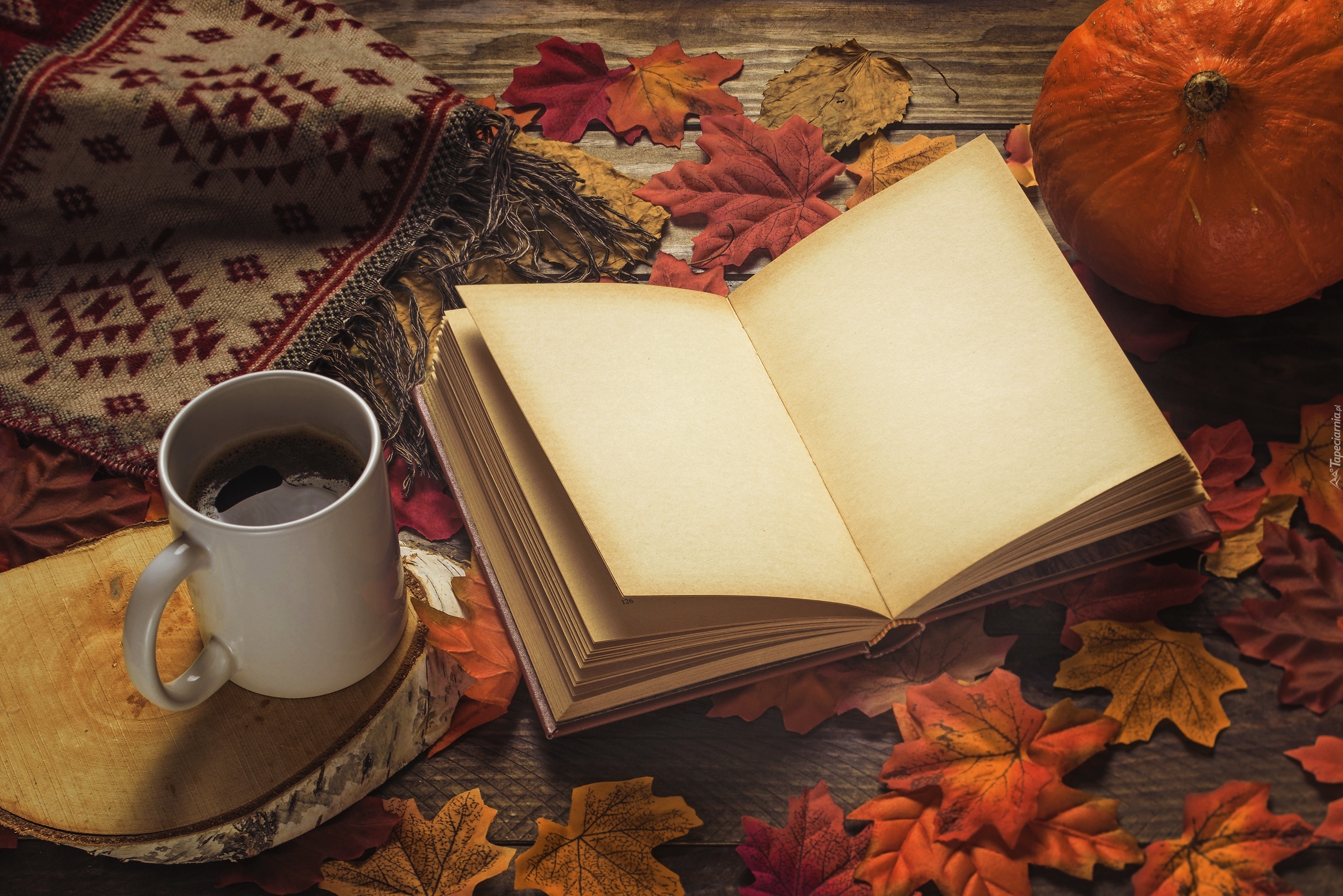 Edytor tapety: Notatnik leżący na liściach obok kubka i szalika