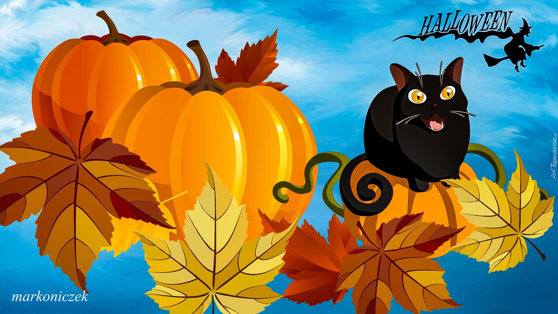 Edytor tapety: Czarny kot na dyni w kompozycji na Halloween