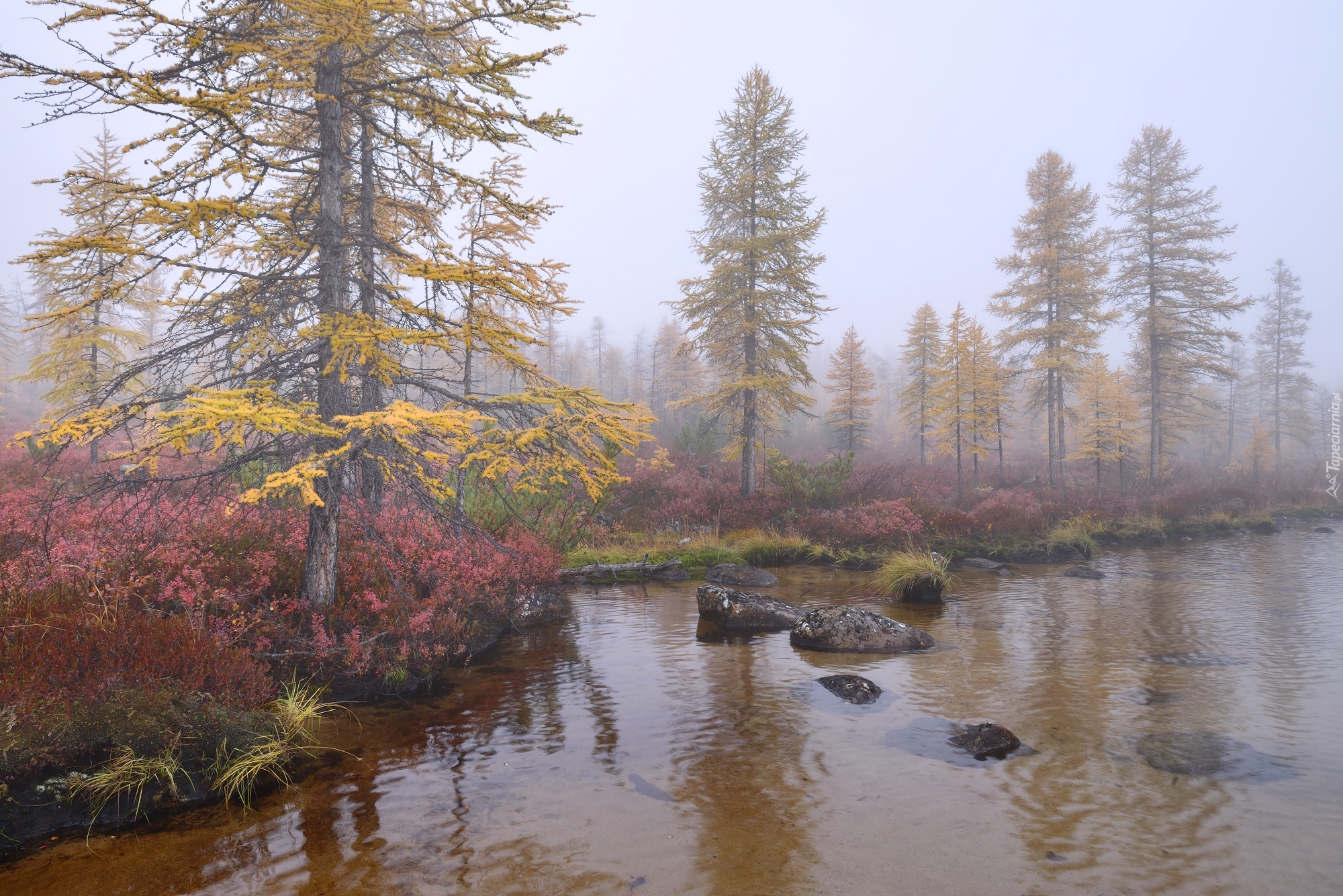 Edytor tapety: Drzewa we mgle na brzegu jeziora Jacka Londona