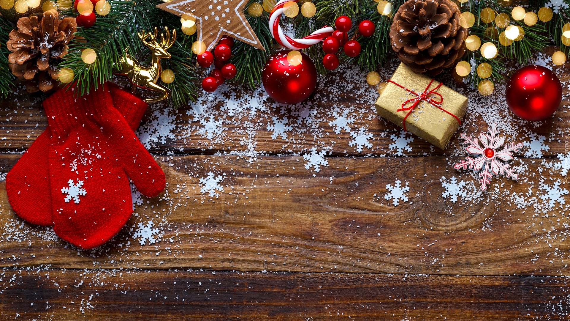 Edytor tapety: Czerwone rękawiczki obok ozdobionych gałązek