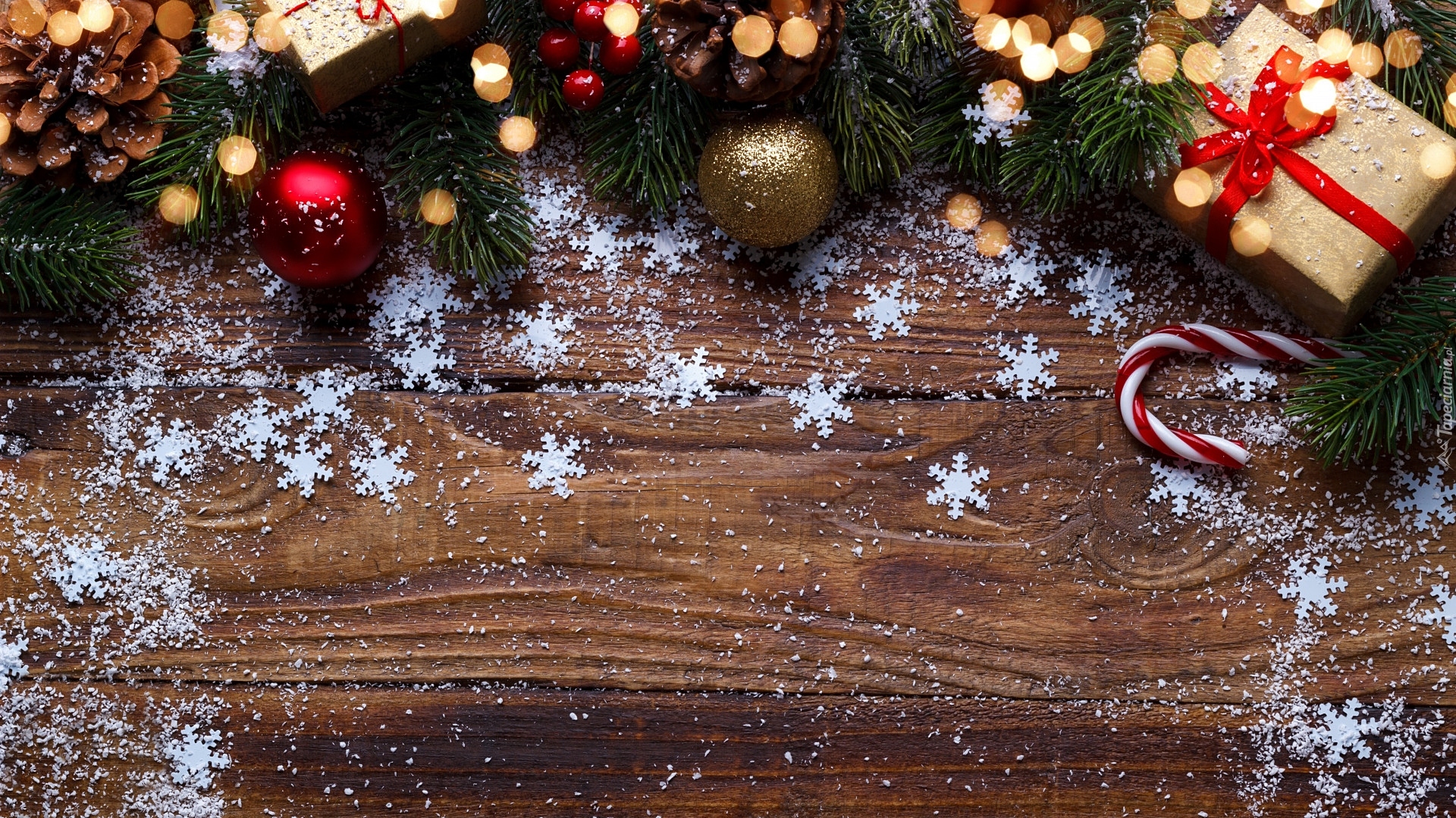 Edytor tapety: Bombki i szyszki na gałązkach obok prezentu