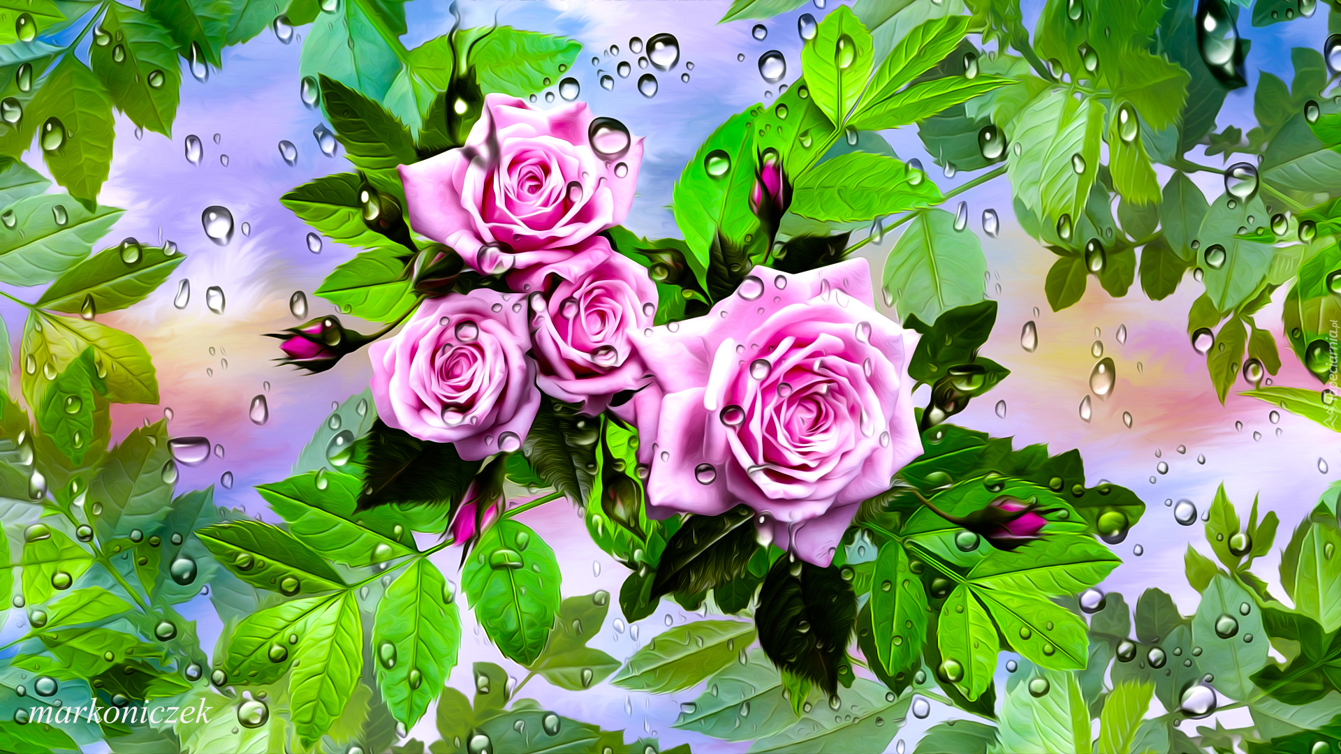 Edytor tapety: Róże i pąki w kroplach wody