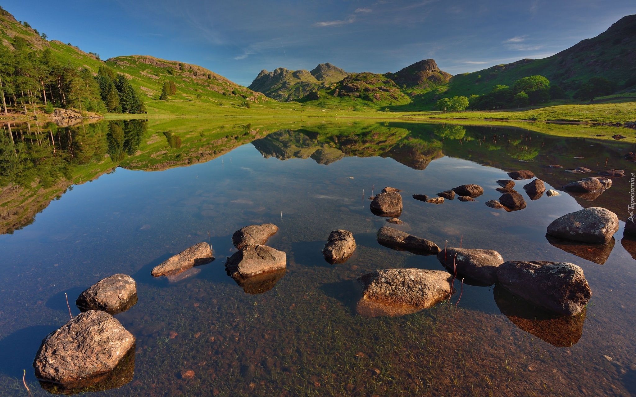 Edytor tapety: Jezioro z widokiem na zielone wzgórza