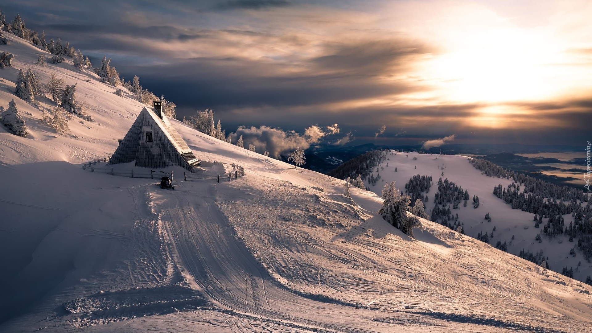 Edytor tapety: Samotny domek na ośnieżonej górze