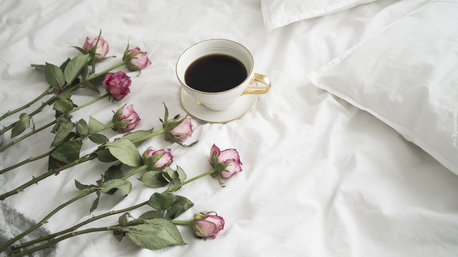 Edytor tapety: Filiżanka kawy na pościeli obok róż