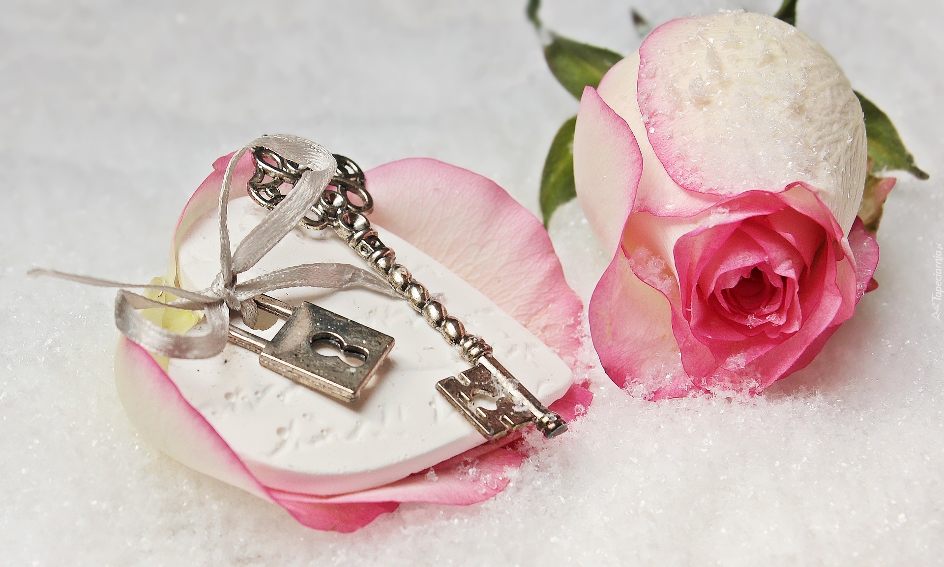 Edytor tapety: Róża z sercem i kłódką na śniegu