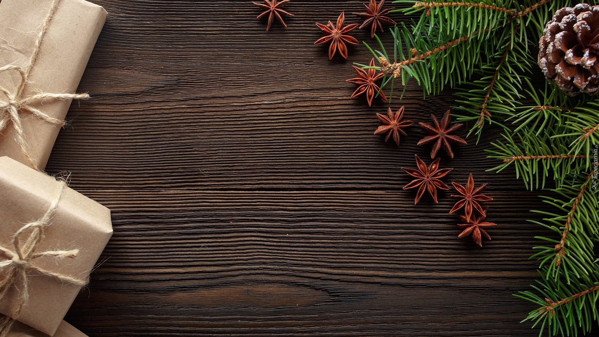Edytor tapety: Prezenty i gałązki świerkowe na deskach