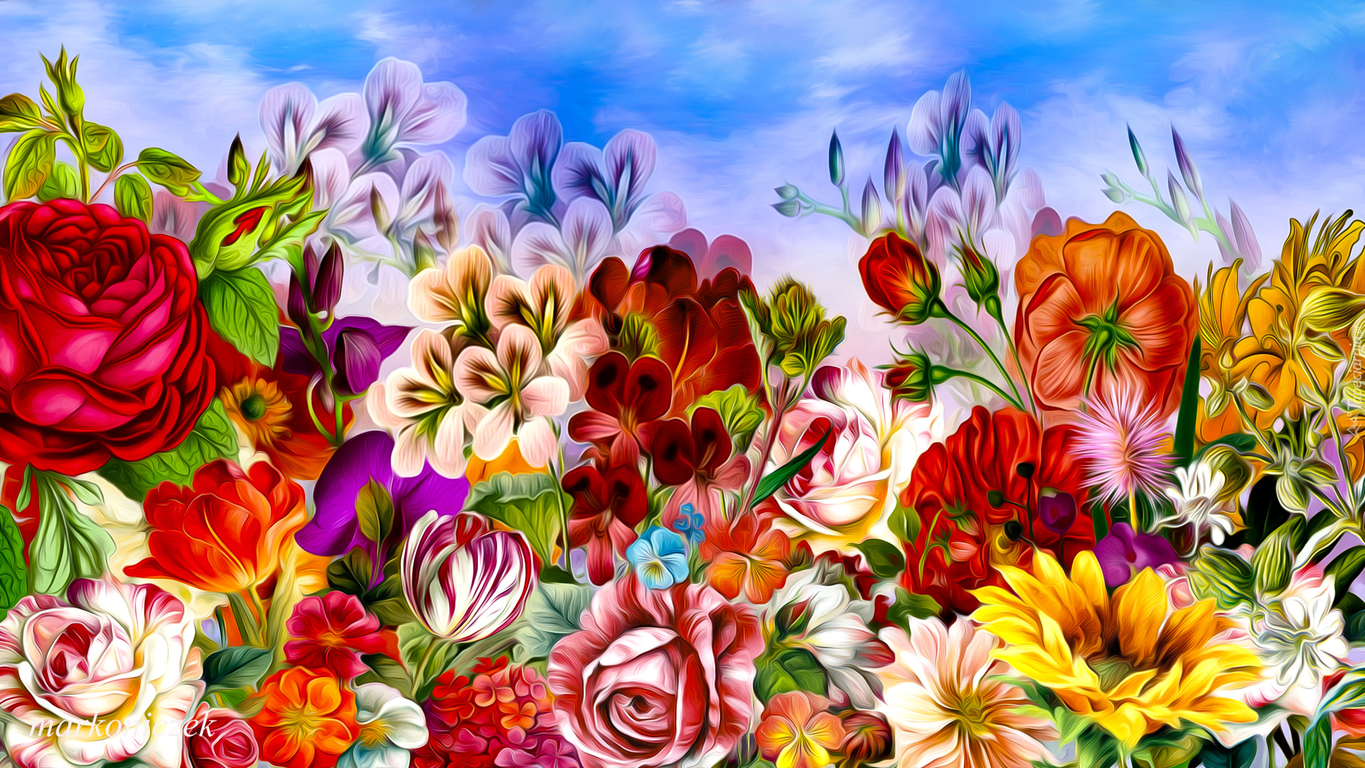 Edytor tapety: Kolorowe kwiaty na tle nieba w grafice