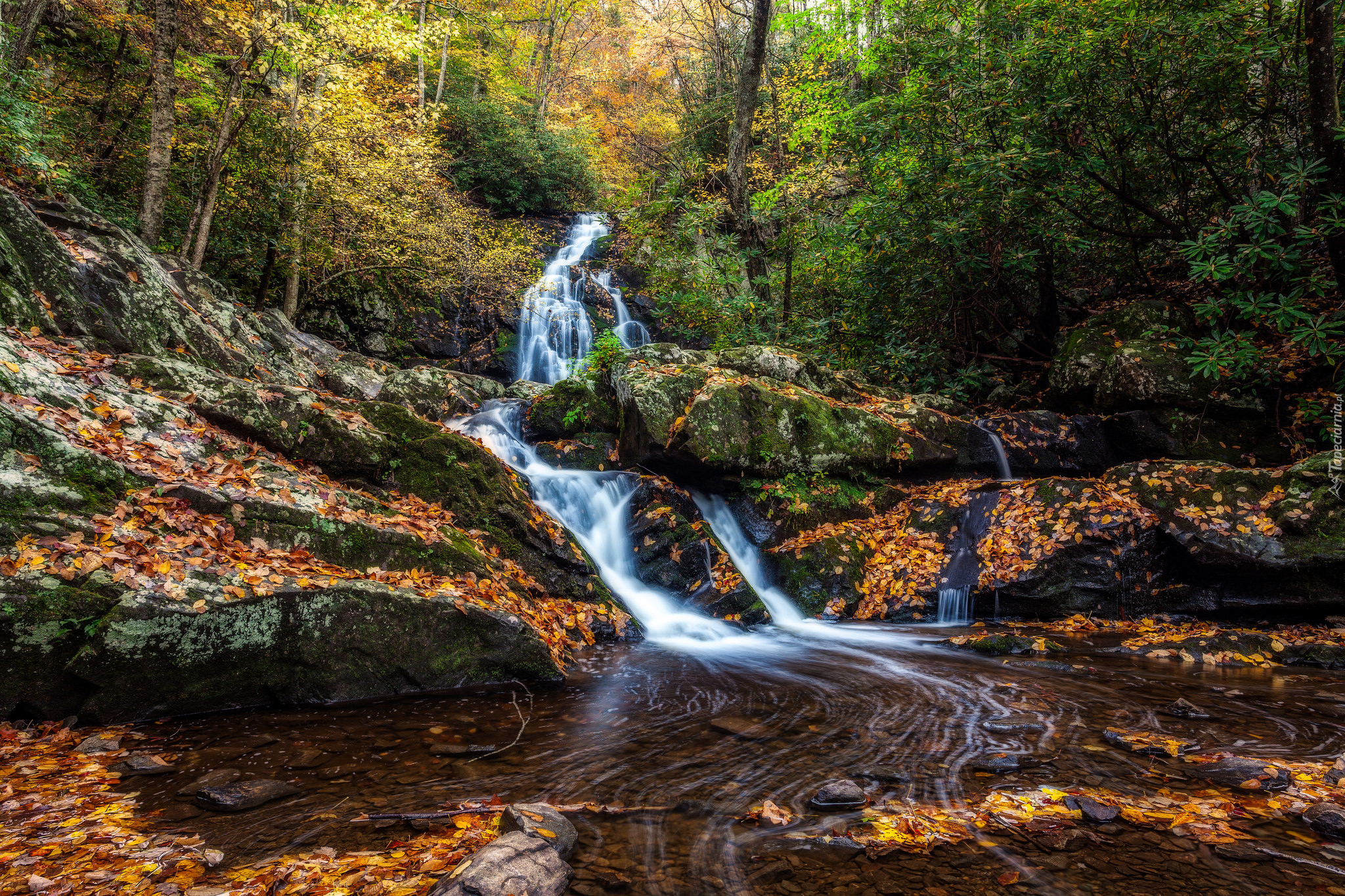 Edytor tapety: Woda spływająca po skałach w jesiennym lesie