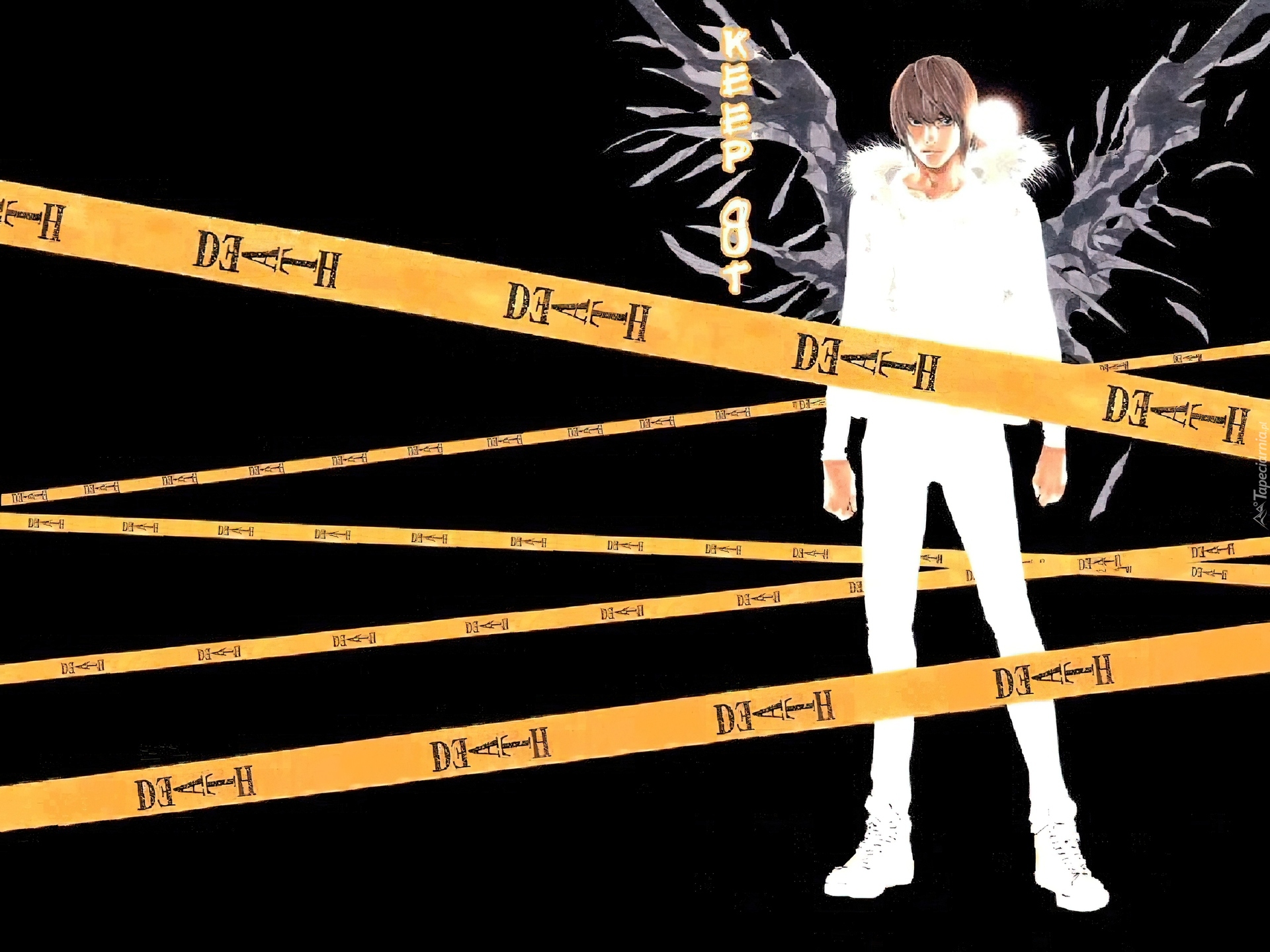 Edytor tapety: Death Note, postać, skrzydła, taśmy, napisy