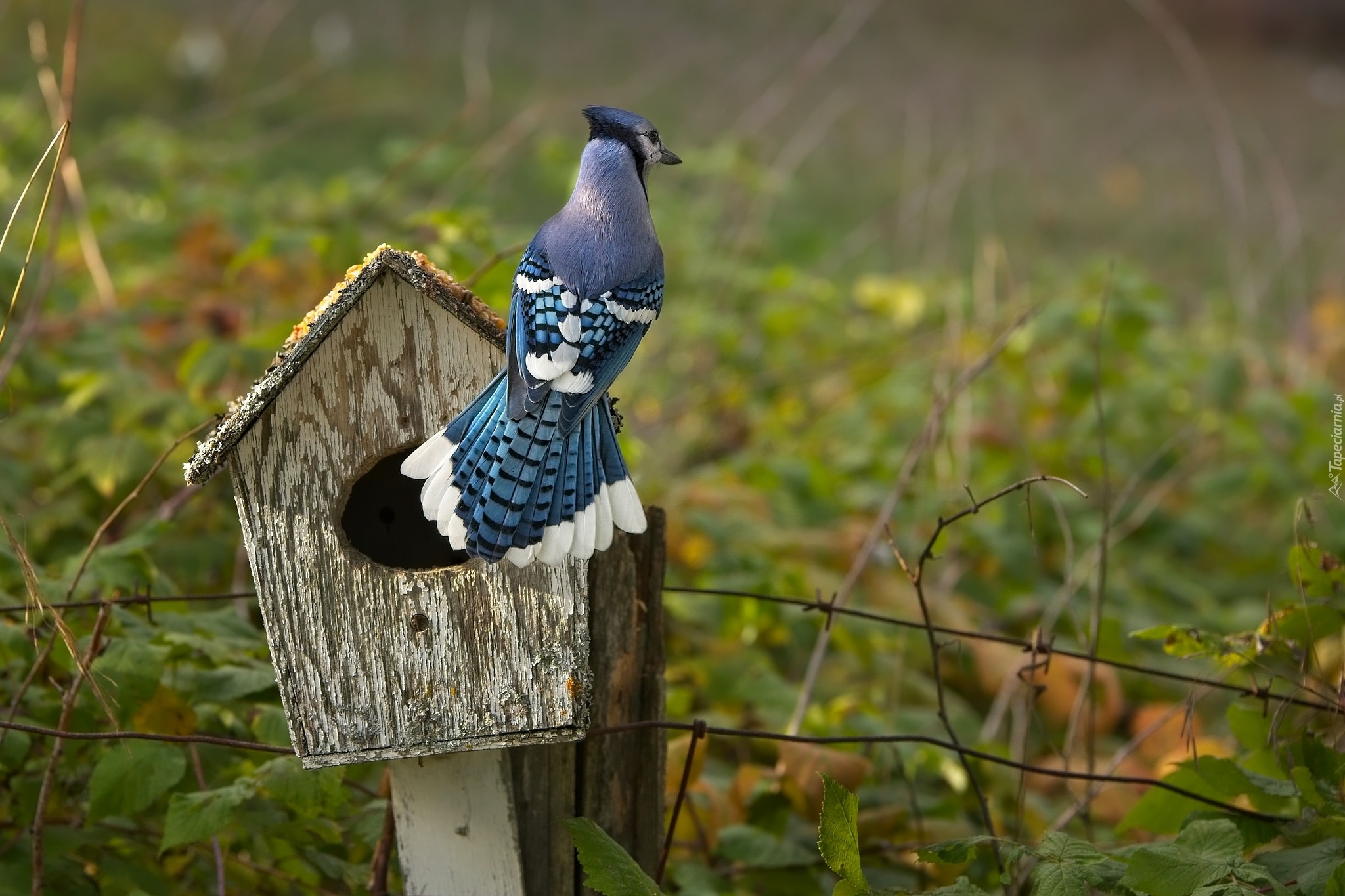 Edytor tapety: Modrosójka na budce lęgowej