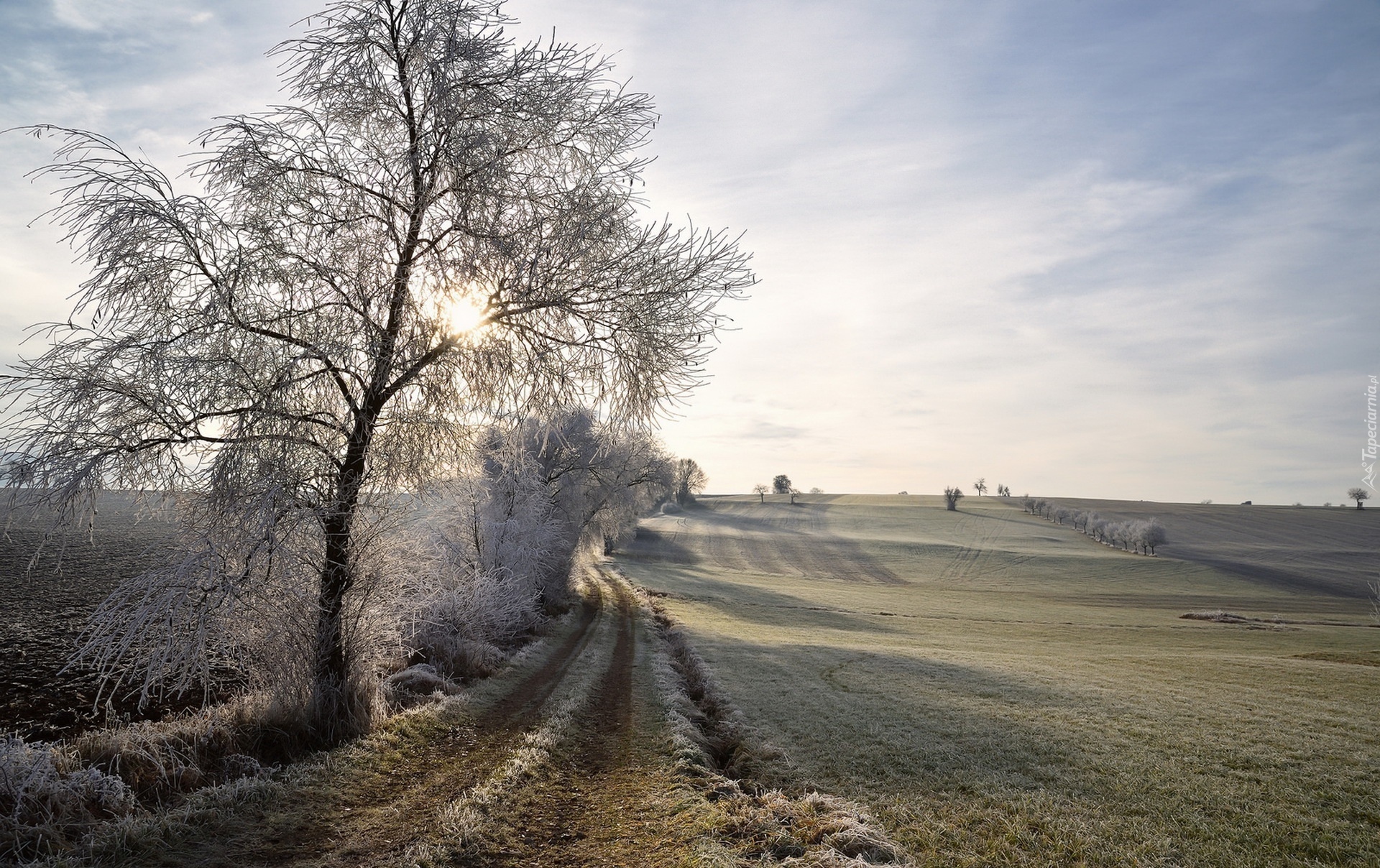Edytor tapety: Oszronione drzewa i pola o poranku