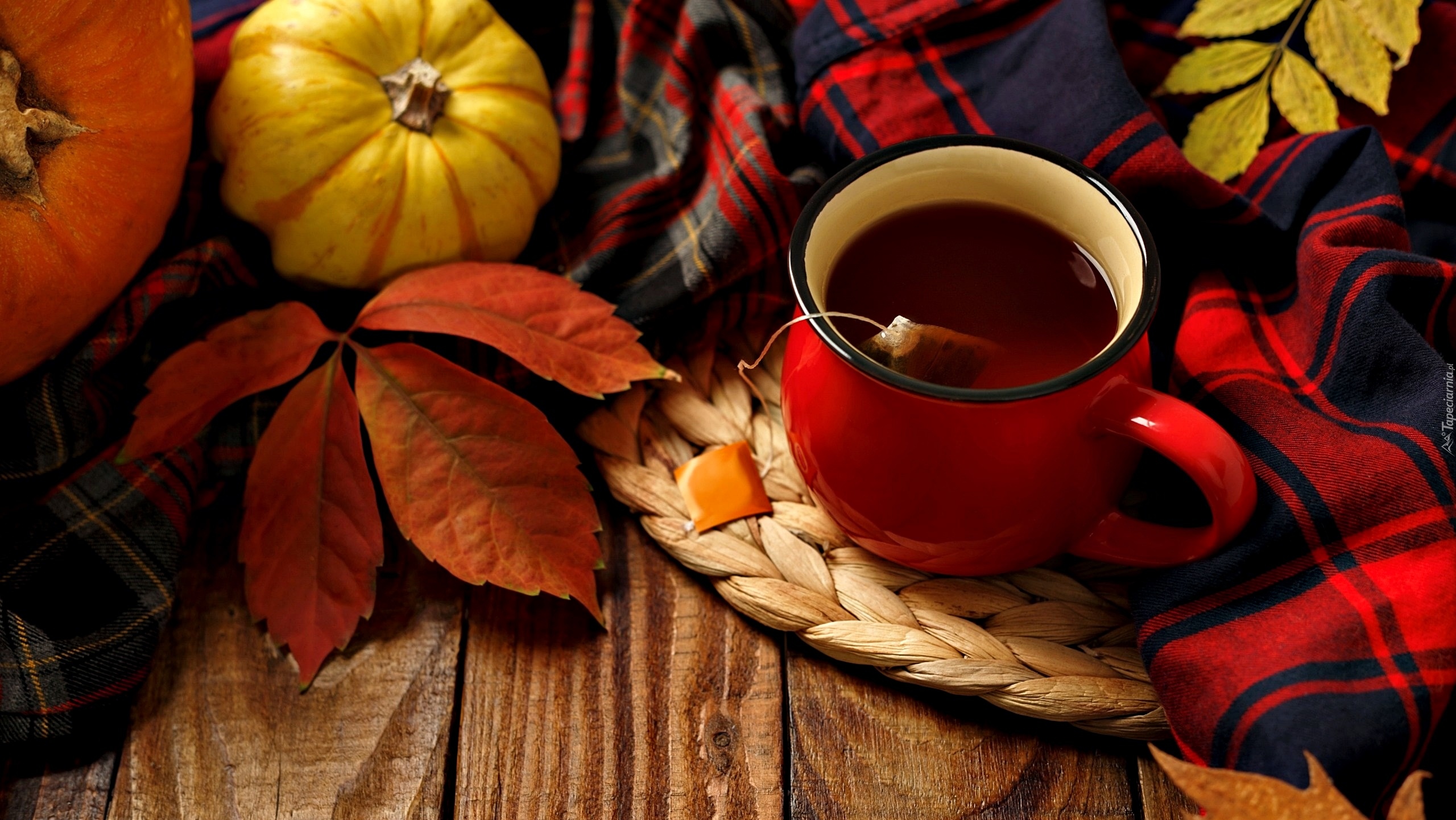 Edytor tapety: Koc i dynie obok herbaty w kubku