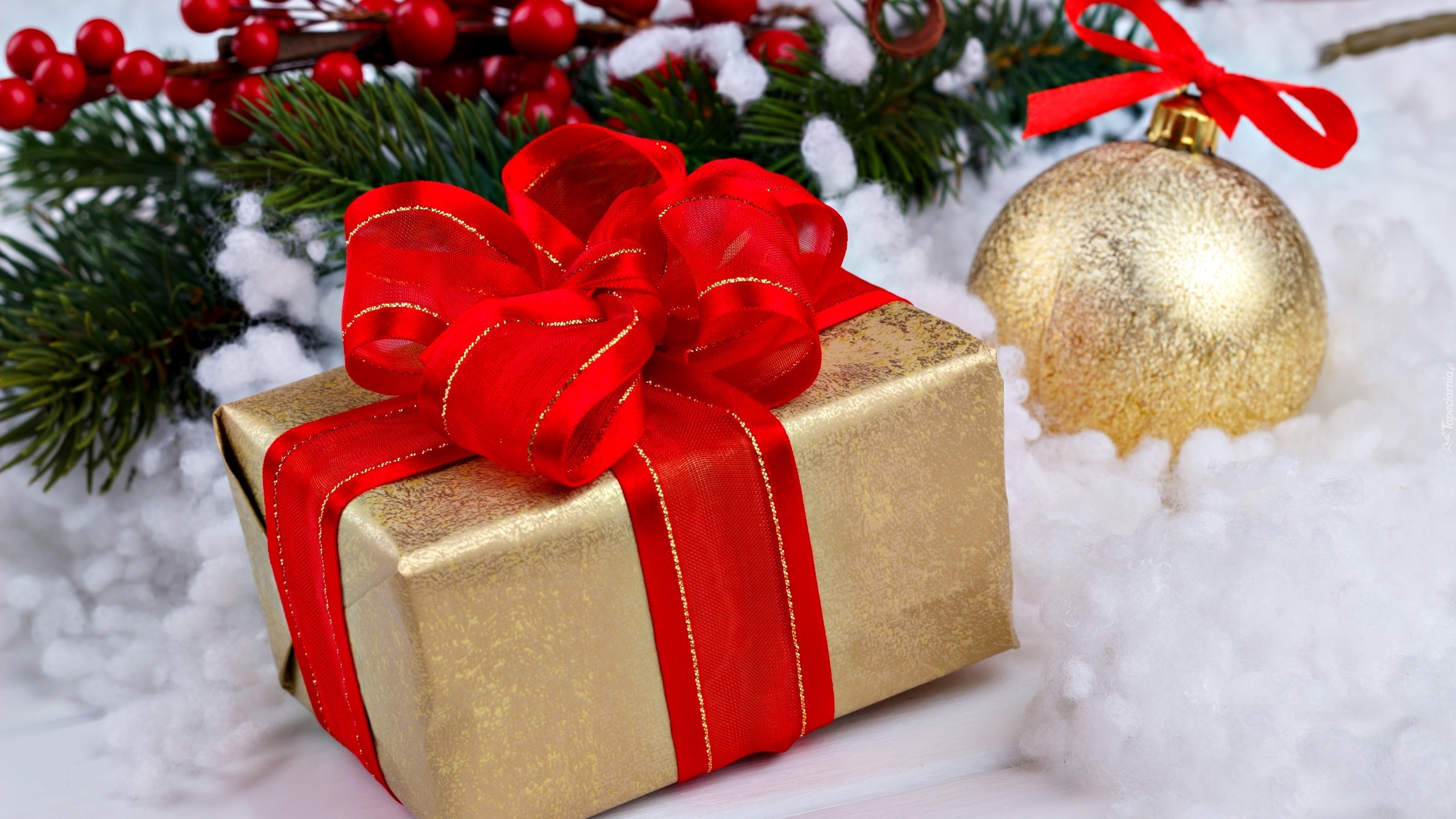 Edytor tapety: Prezent z czerwoną kokardą obok bombki