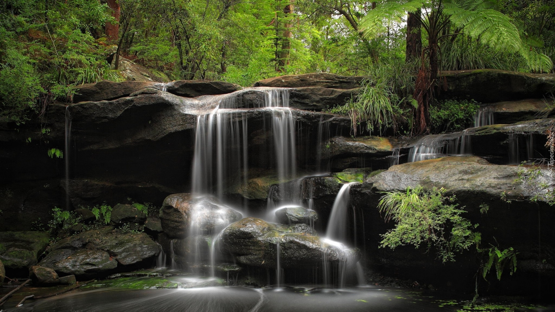 Edytor tapety: Skalny wodospad w gęstym lesie