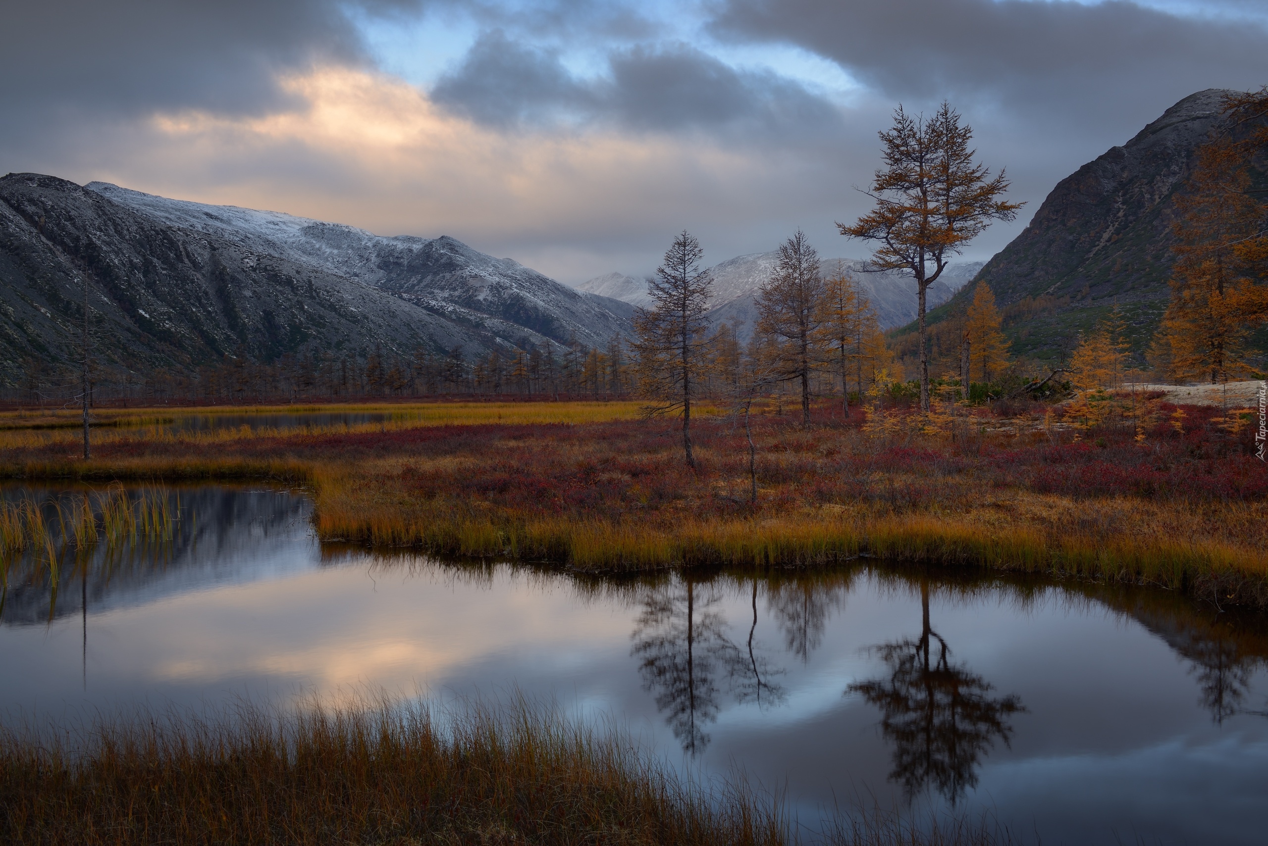 Edytor tapety: Jesienne drzewa i trawy przy jeziorze Jacka Londona