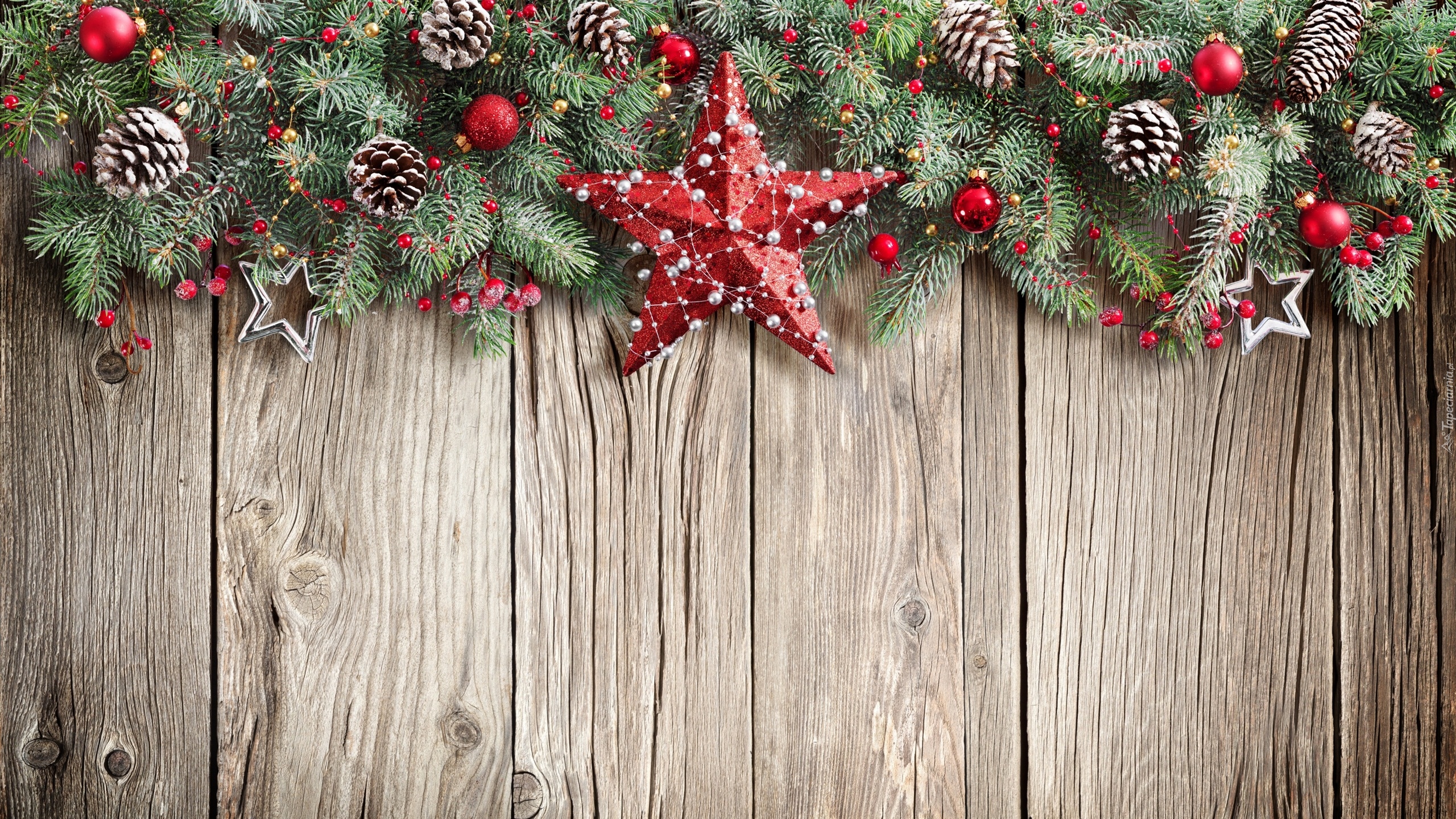 Edytor tapety: Szyszki i bombki wokół czerwonej gwiazdy