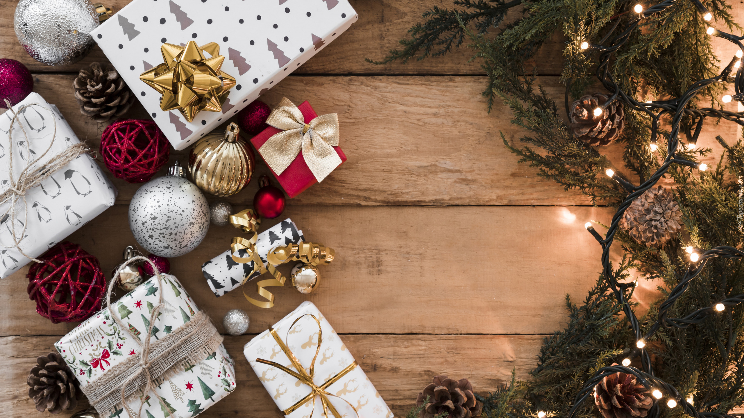 Edytor tapety: Kolorowe bombki wśród prezentów obok gałązek i światełek