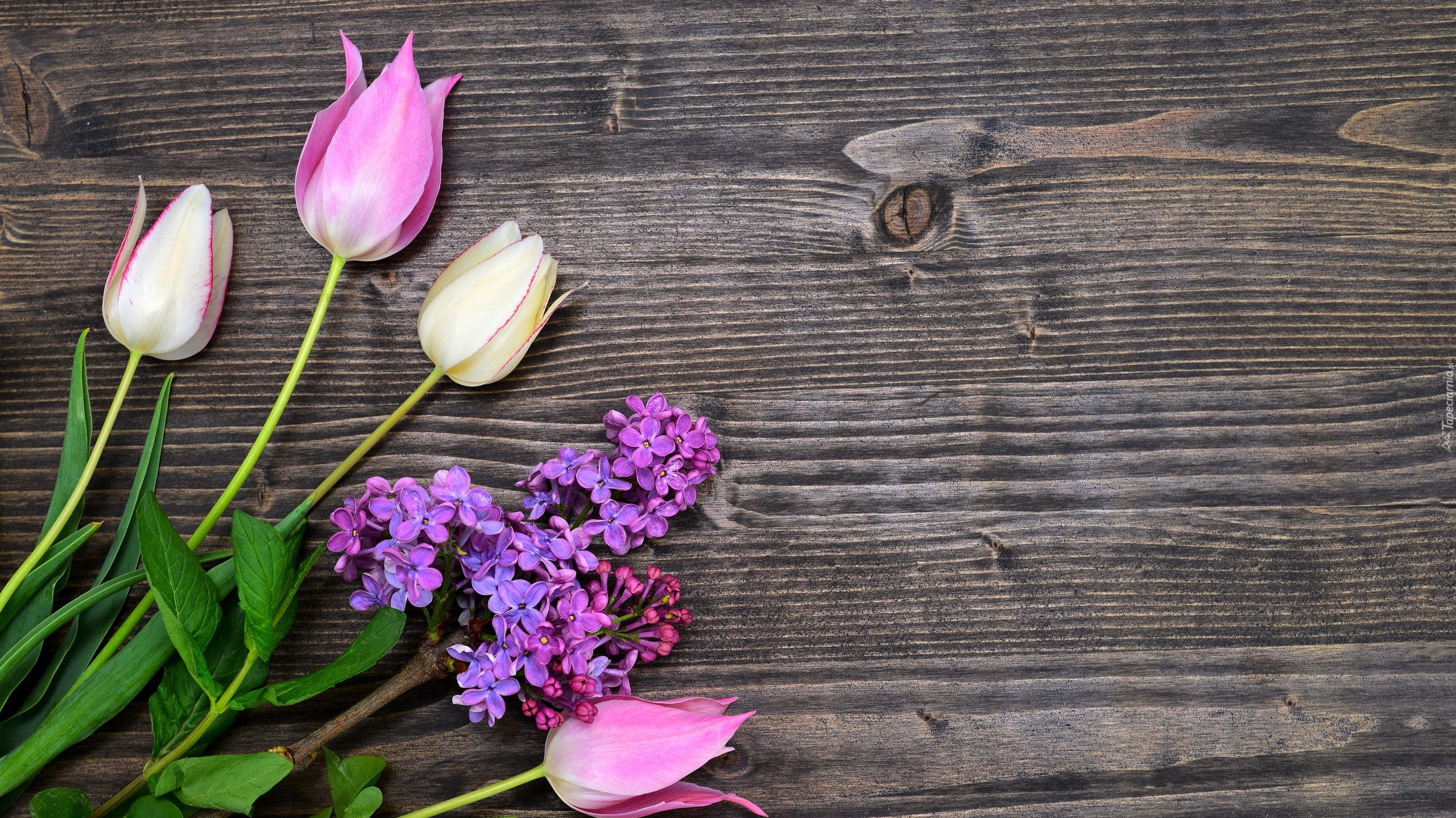 Edytor tapety: Gałązka bzu i tulipany na deskach