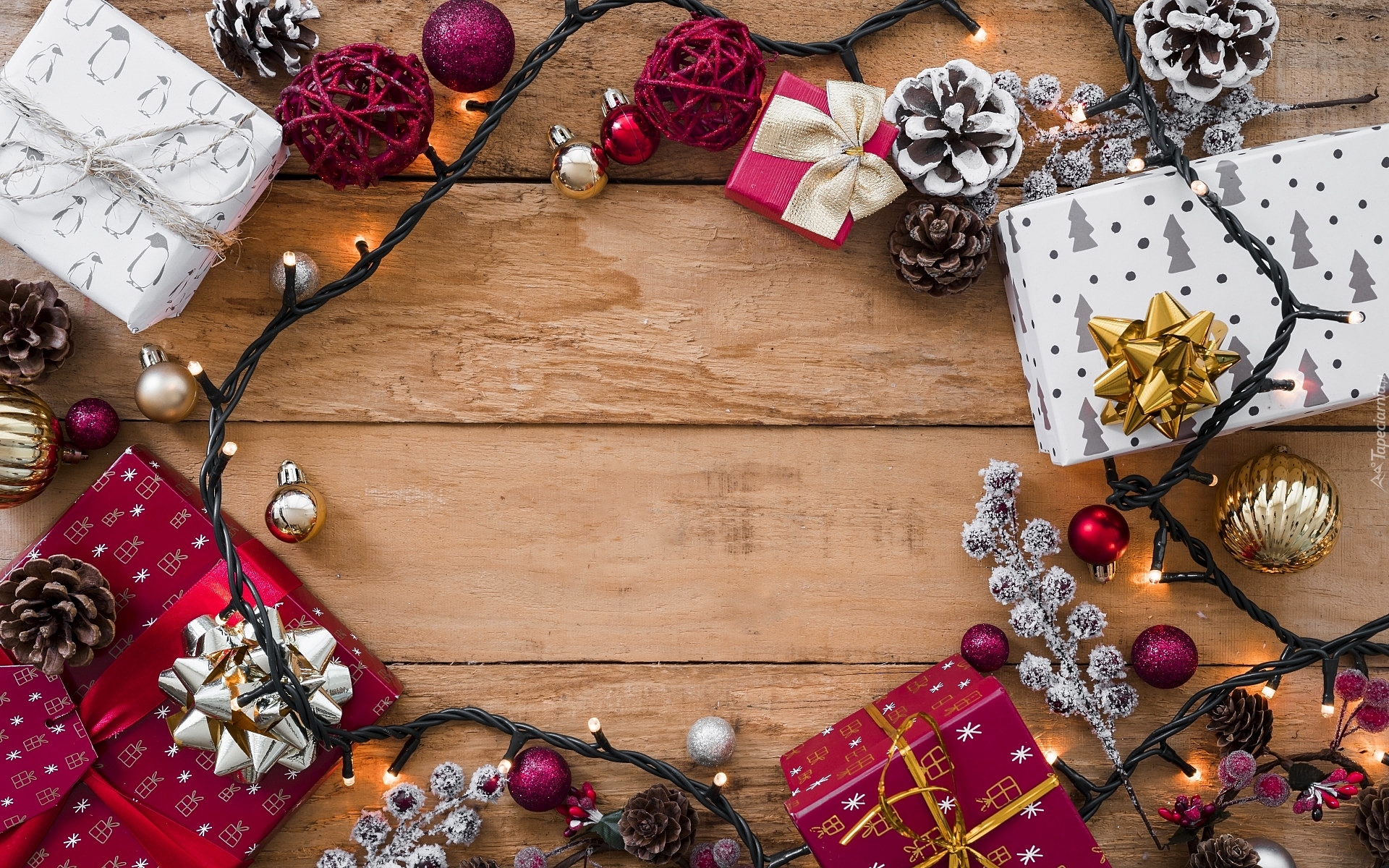 Edytor tapety: Bombki i światełka pośród prezentów