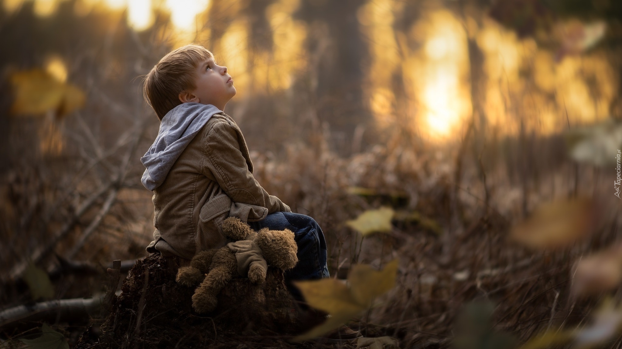 Edytor tapety: Chłopczyk z pluszakiem na pniu drzewa